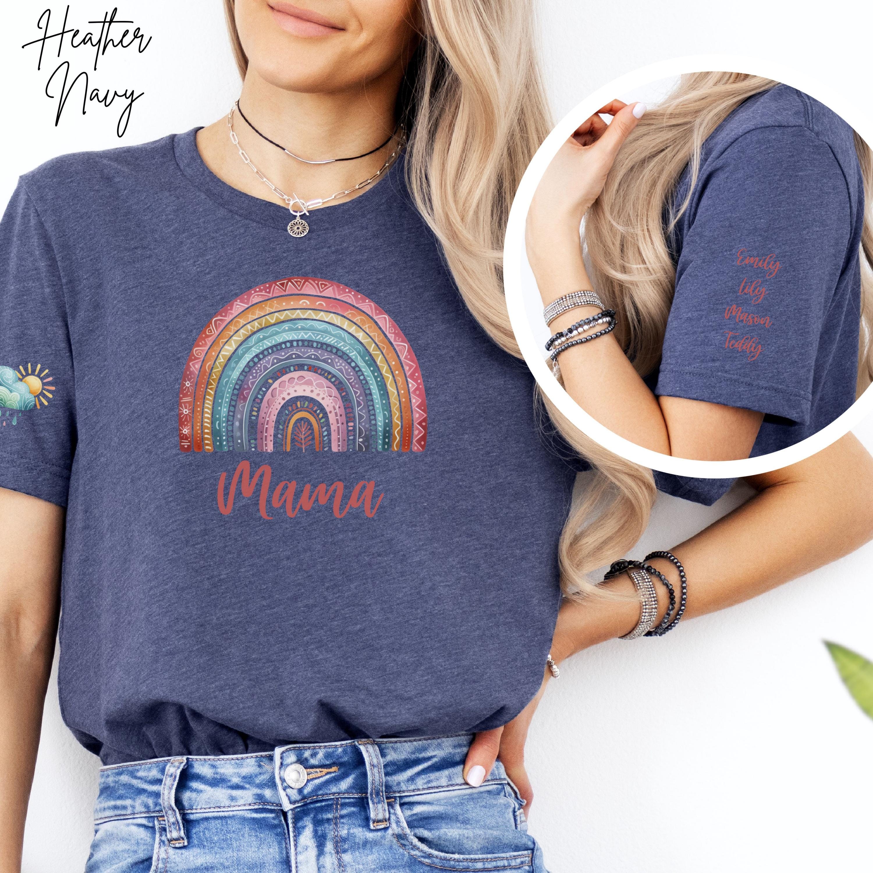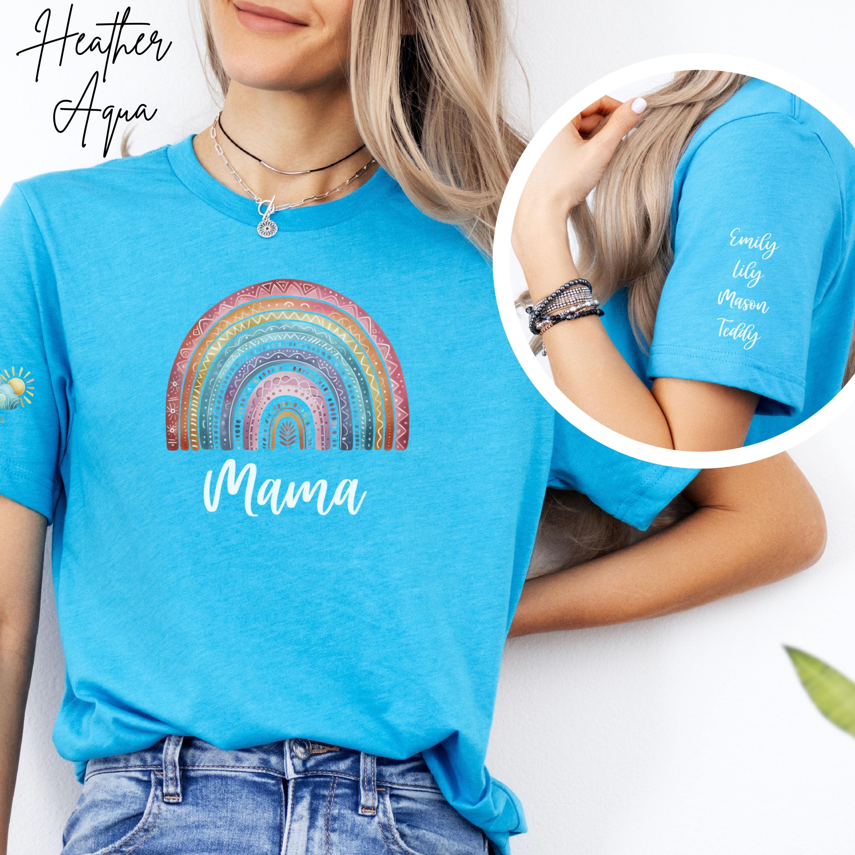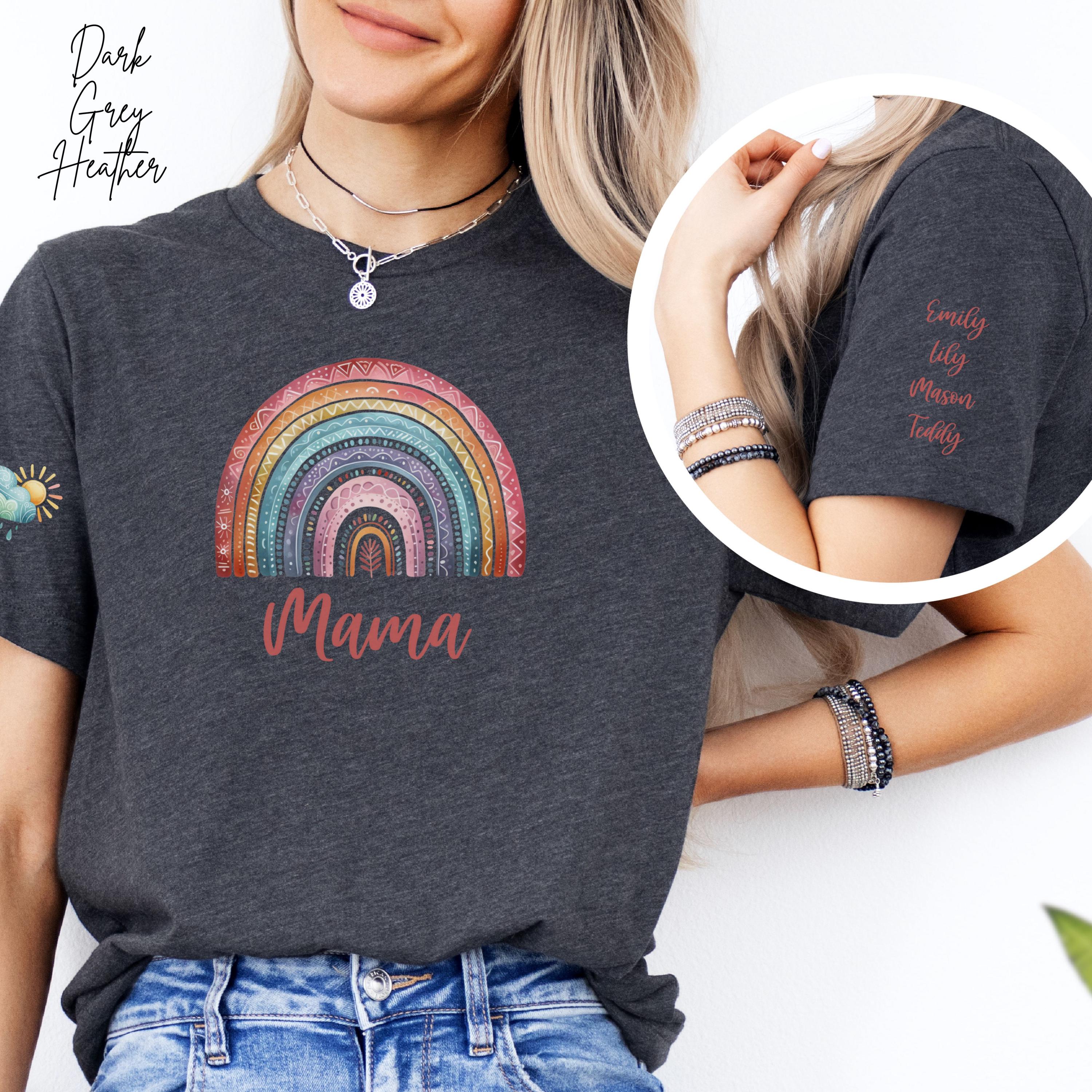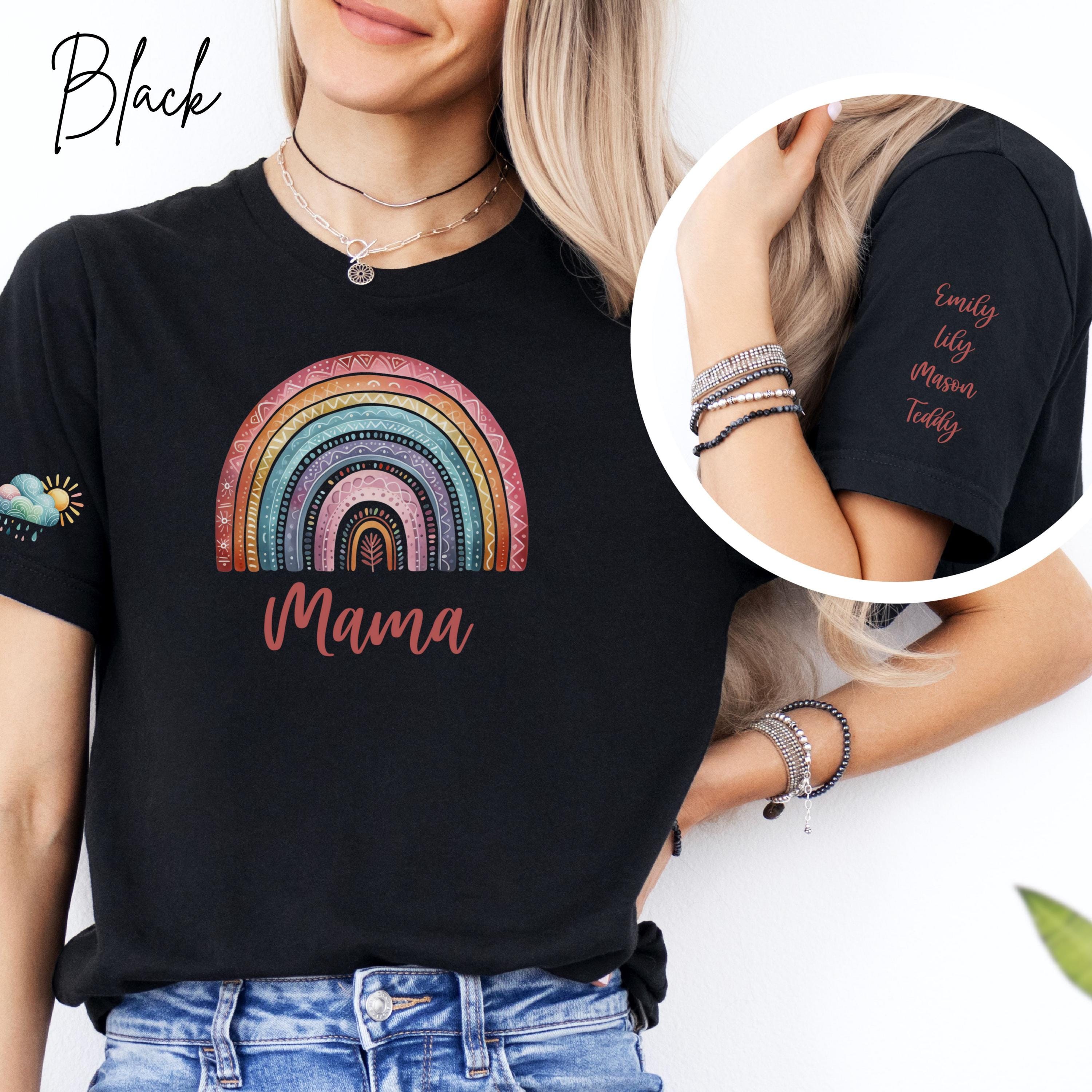 Celebrate the journey of motherhood with this heartfelt tee featuring a vibrant rainbow and the word “Mama” in elegant script. Personalize the left sleeve with up to four names—each printed in boutique-style lettering close to the heart. The right sleeve carries a symbolic sun-and-raincloud graphic, representing the warmth, resilience, and beauty of weathering life’s seasons.