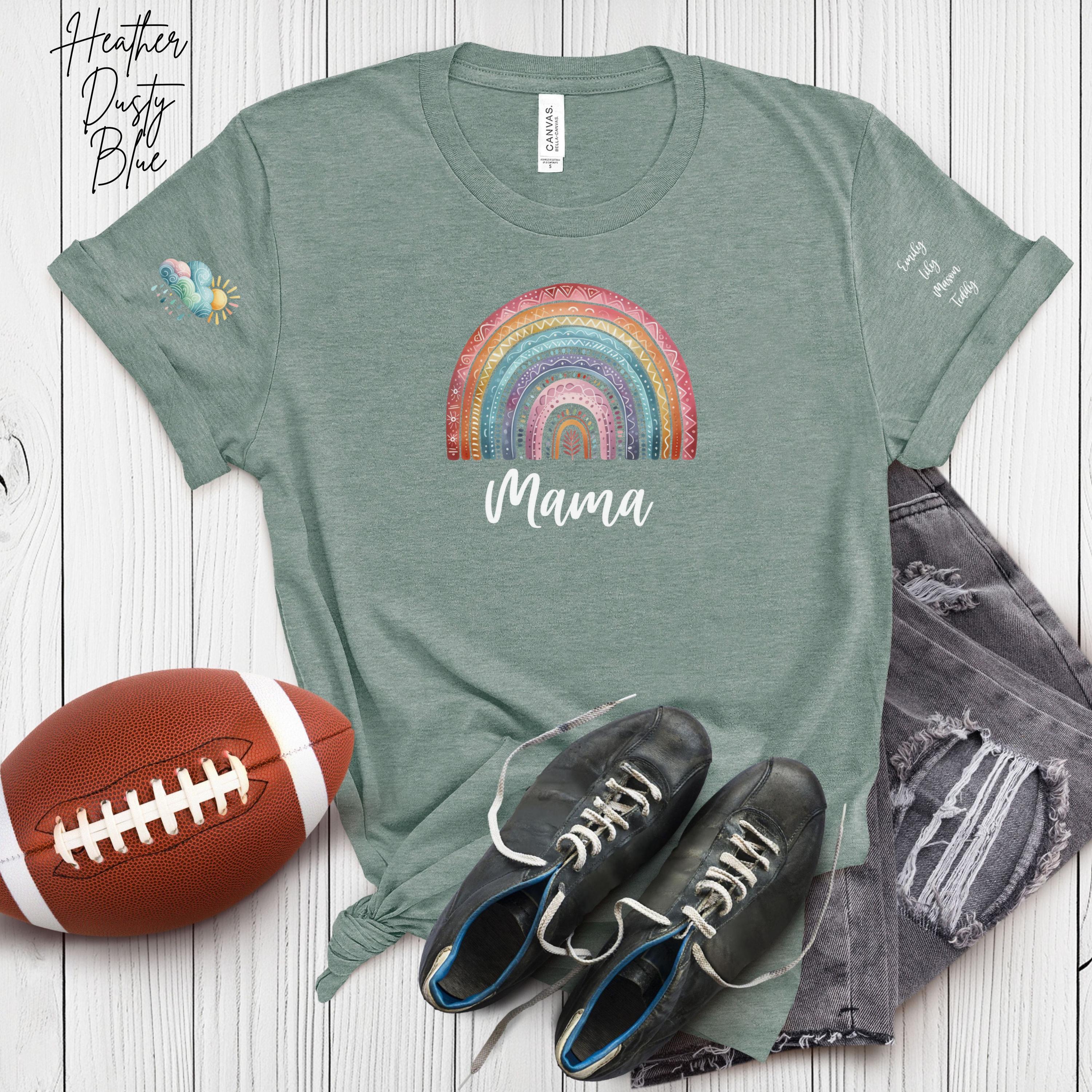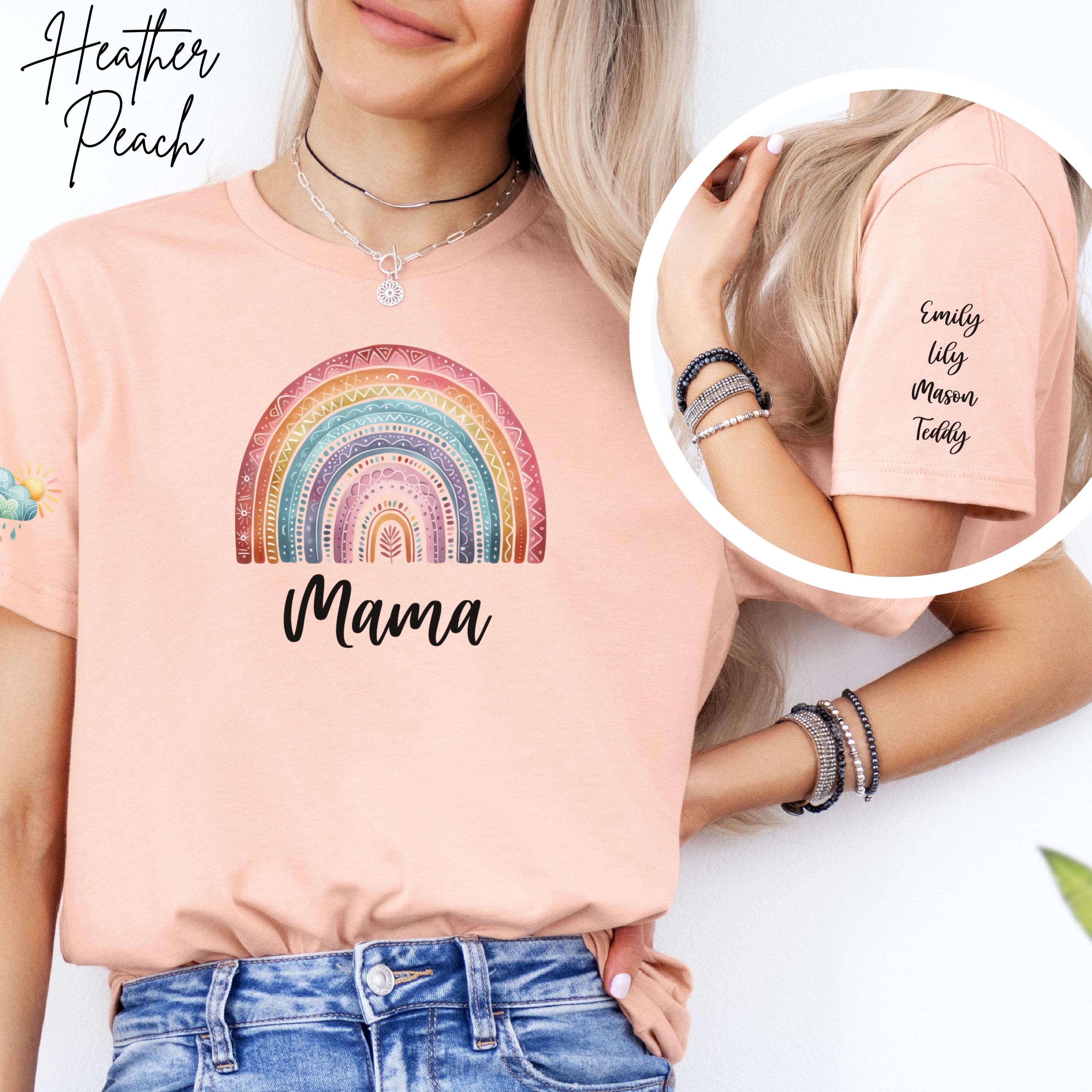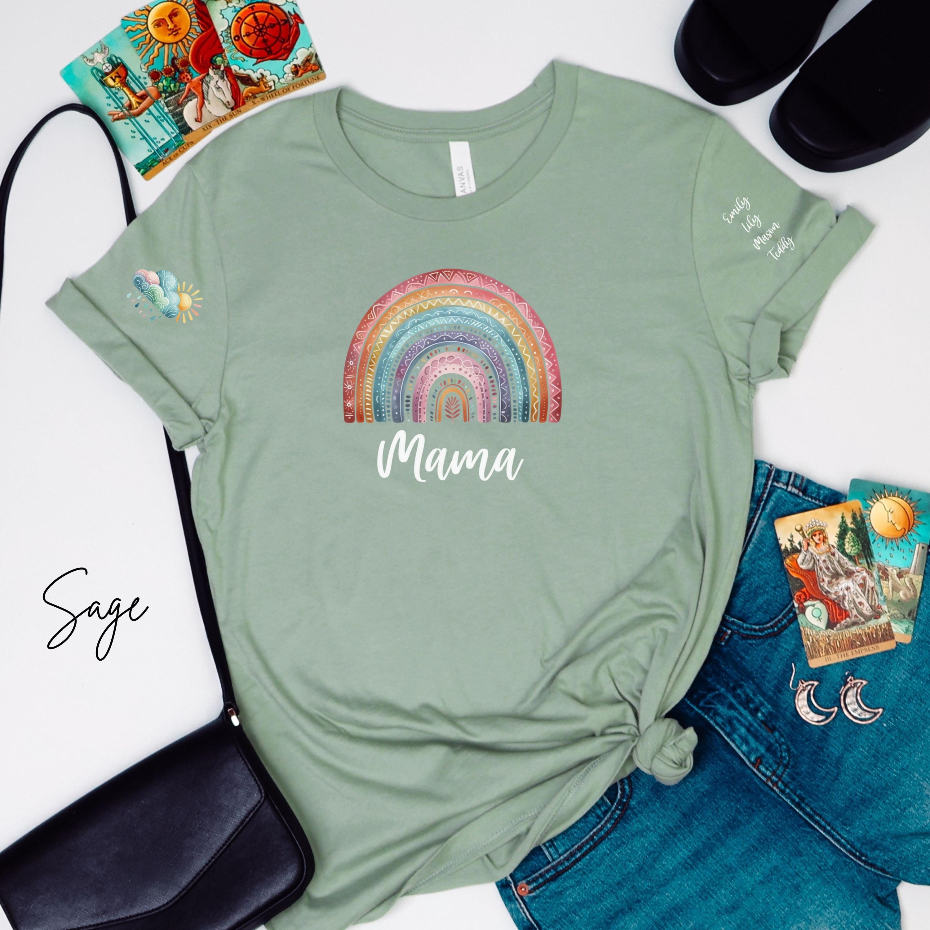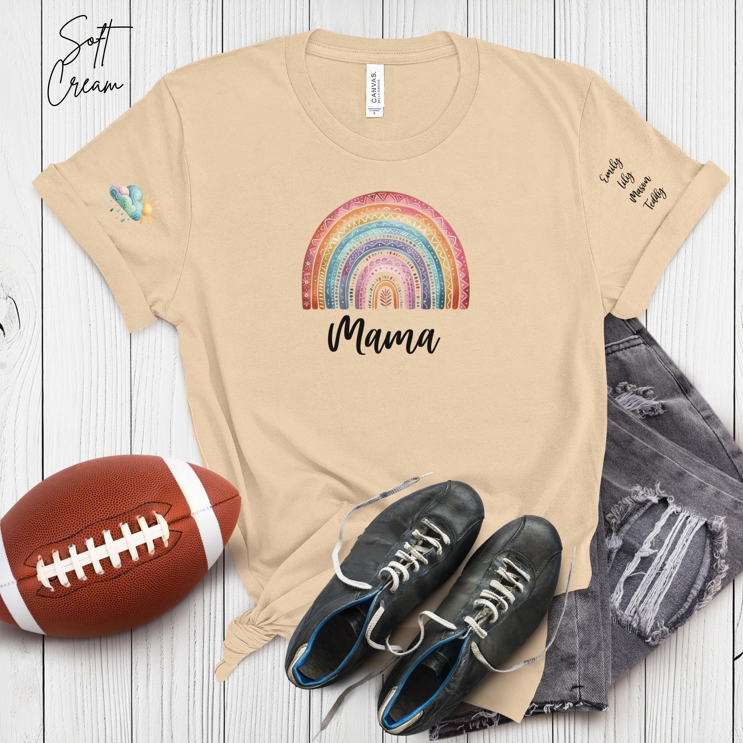 Celebrate the journey of motherhood with this heartfelt tee featuring a vibrant rainbow and the word “Mama” in elegant script. Personalize the left sleeve with up to four names—each printed in boutique-style lettering close to the heart. The right sleeve carries a symbolic sun-and-raincloud graphic, representing the warmth, resilience, and beauty of weathering life’s seasons.