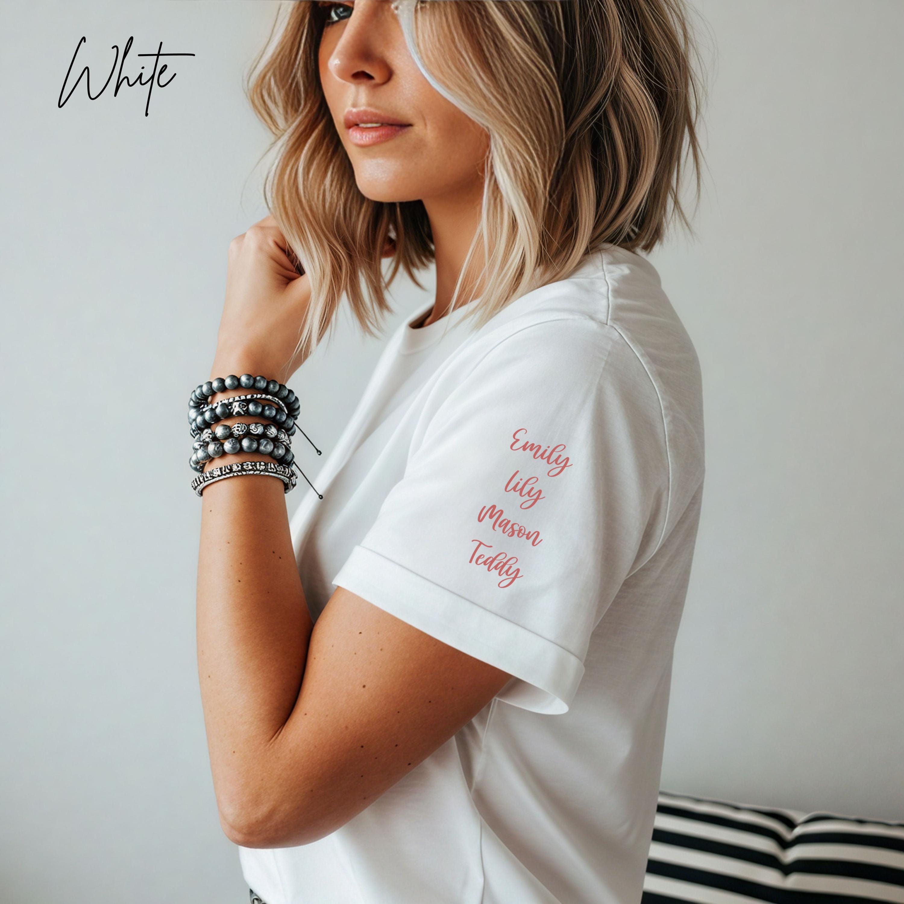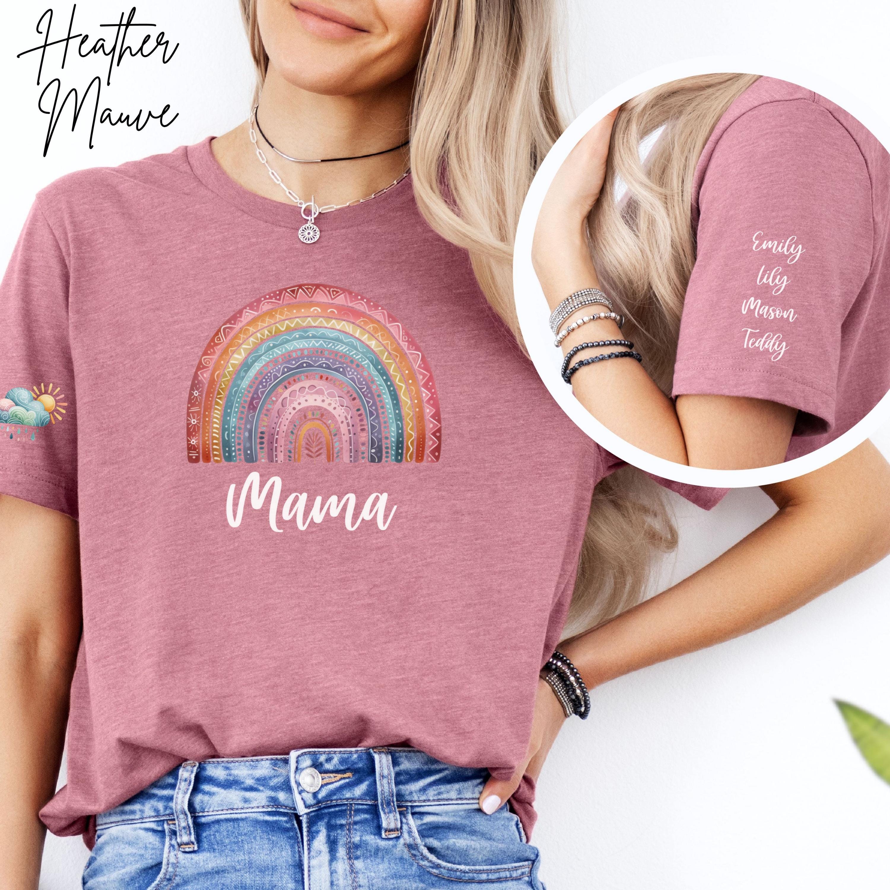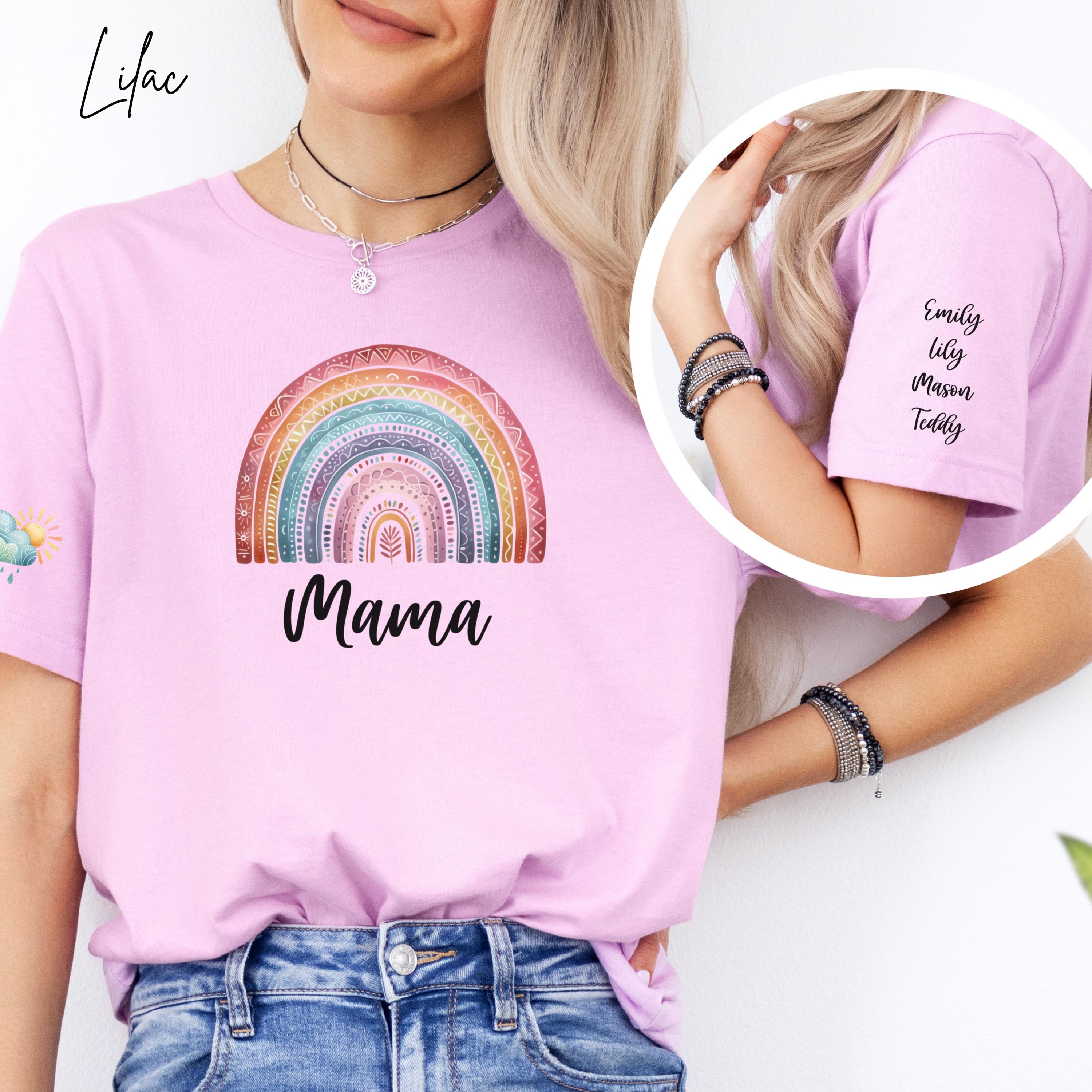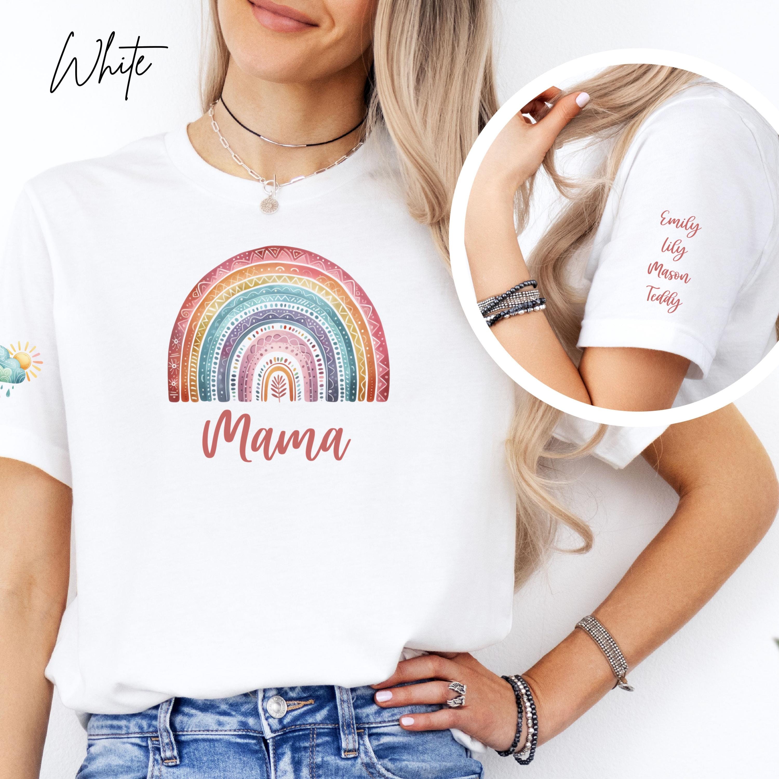 Celebrate the journey of motherhood with this heartfelt tee featuring a vibrant rainbow and the word “Mama” in elegant script. Personalize the left sleeve with up to four names—each printed in boutique-style lettering close to the heart. The right sleeve carries a symbolic sun-and-raincloud graphic, representing the warmth, resilience, and beauty of weathering life’s seasons.