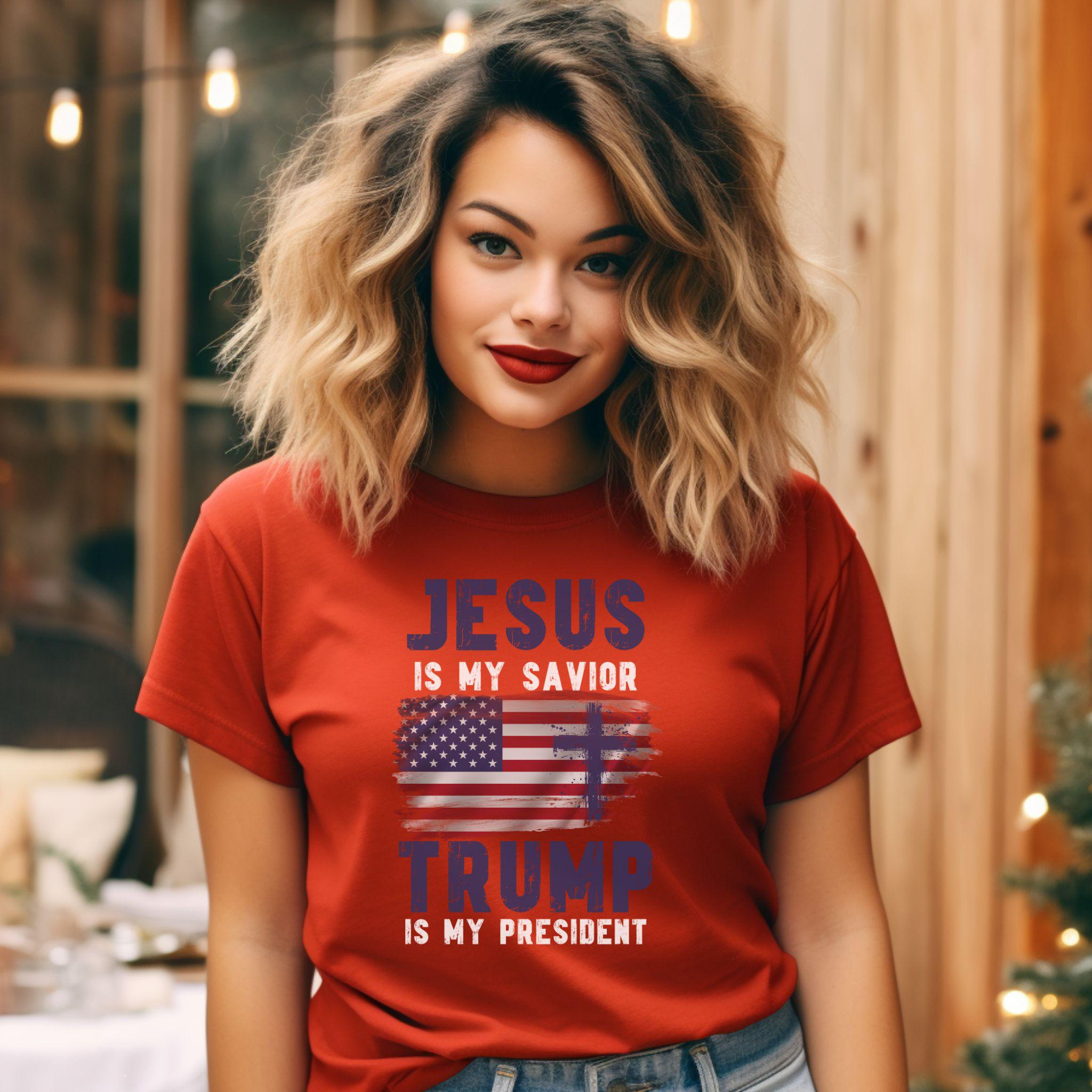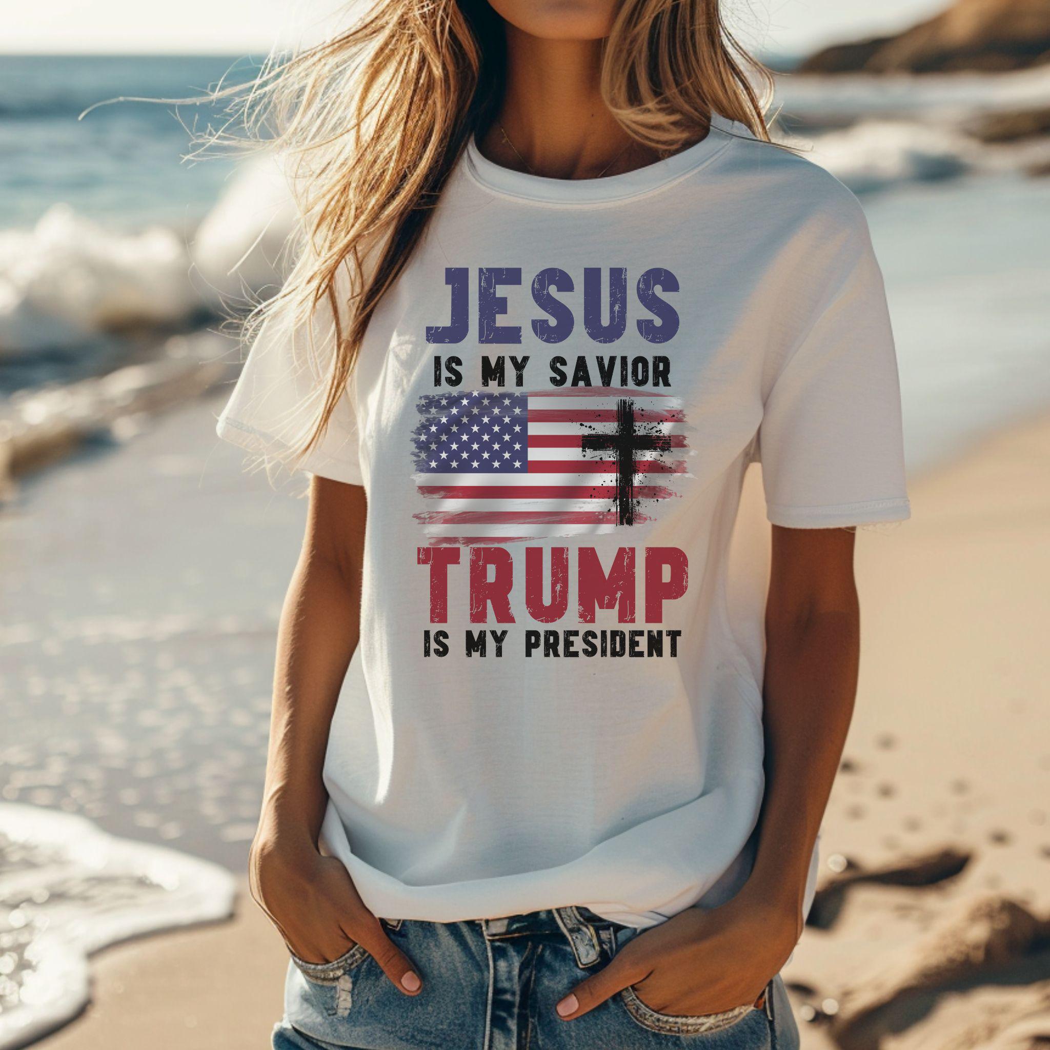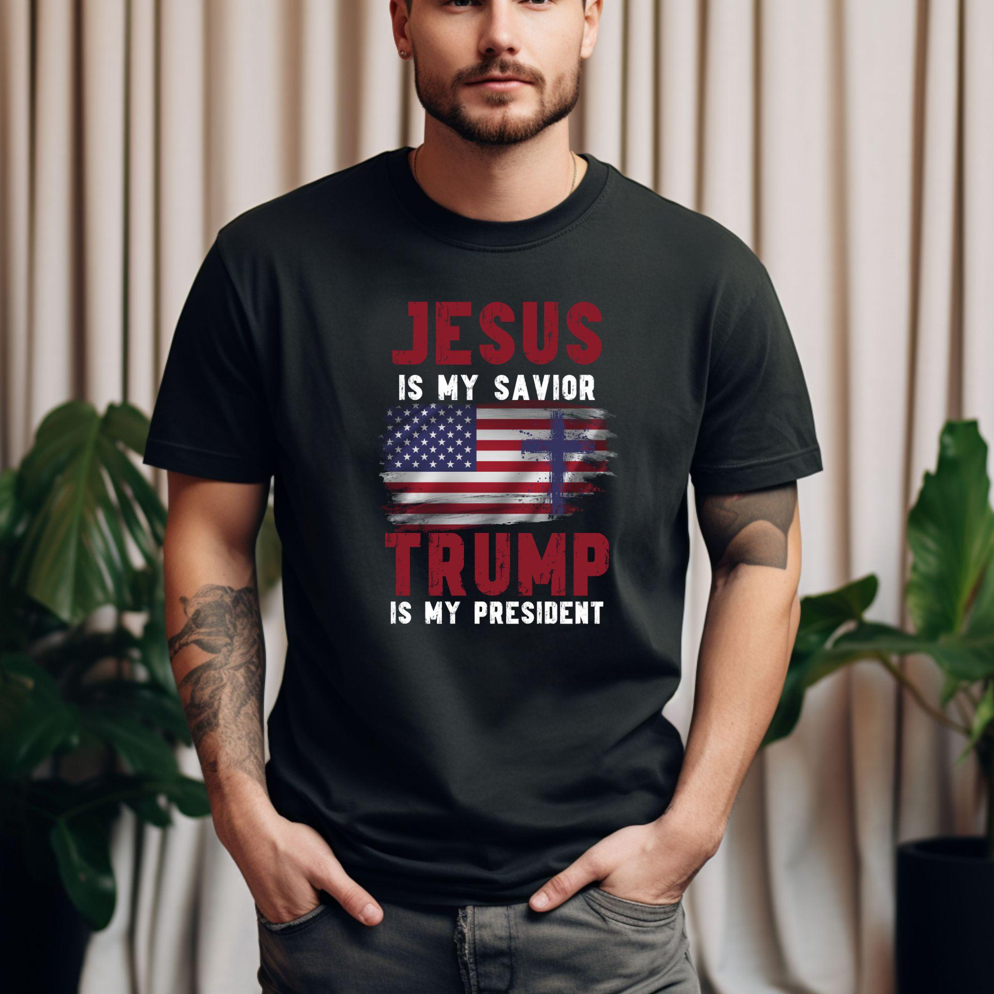 Show off your faith and political stance with our bold “Jesus Is My Savior, Trump Is My President” t-shirt! This striking design features a distressed American flag and powerful text in white, purple, and red. Perfect for those who proudly stand by their beliefs, this shirt is a great conversation starter and a unique addition to your wardrobe. Made from soft, high-quality fabric, it’s comfortable for everyday wear. Whether you’re attending a rally, a church event, or just hanging out with friends, this t-shirt is sure to make a statement.