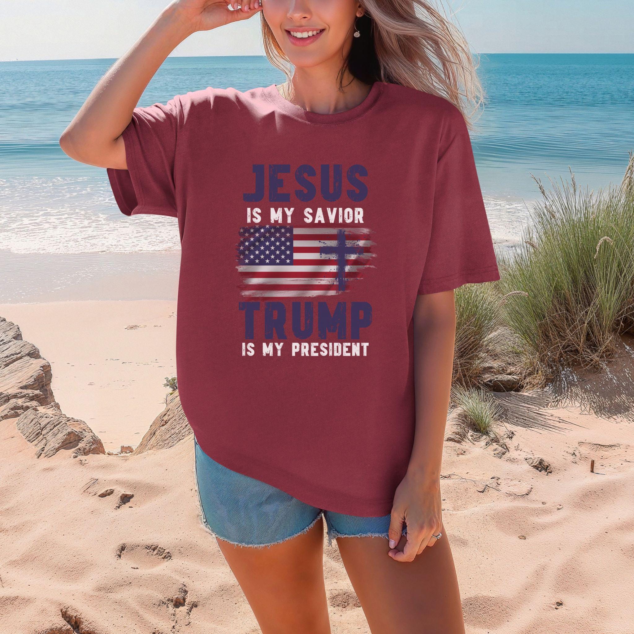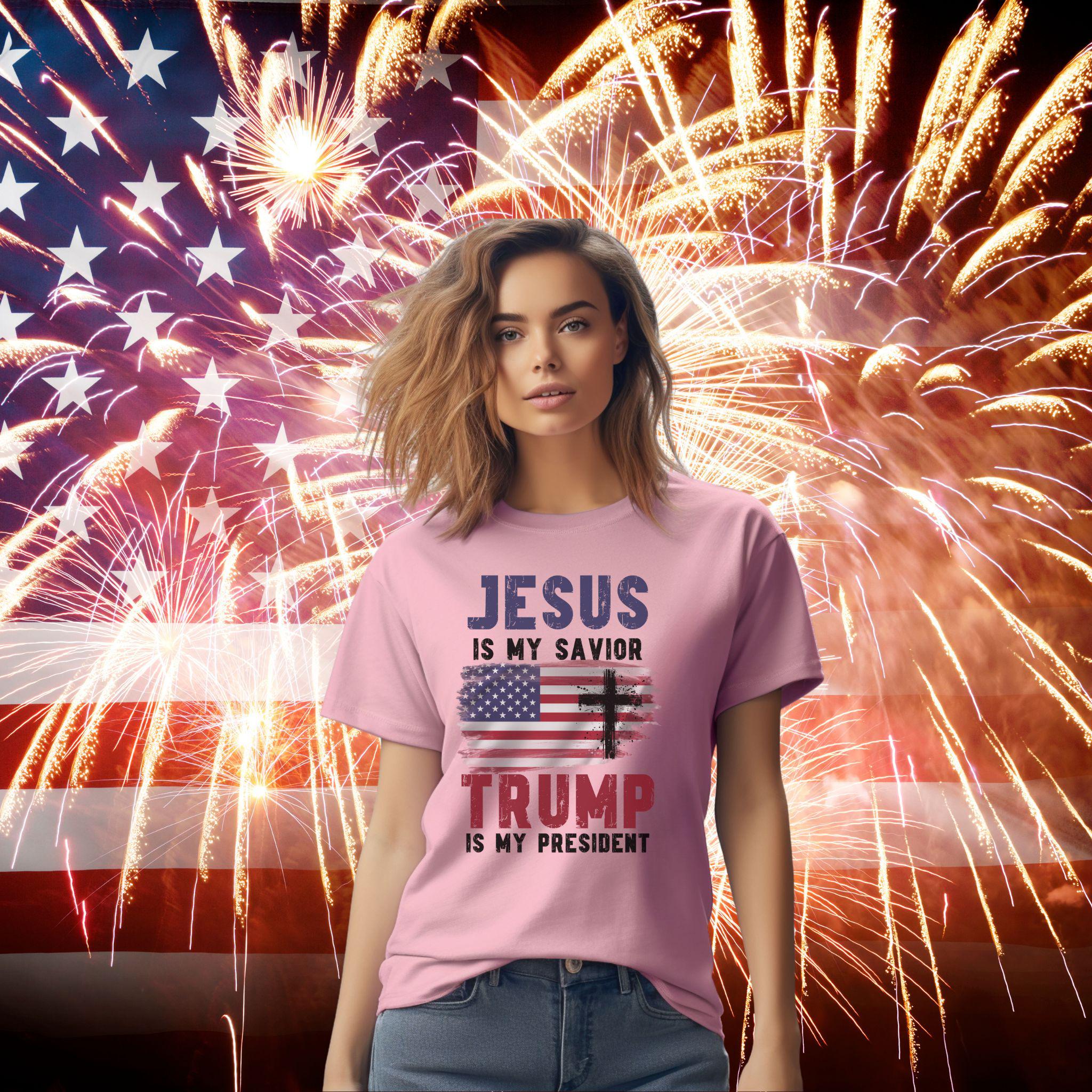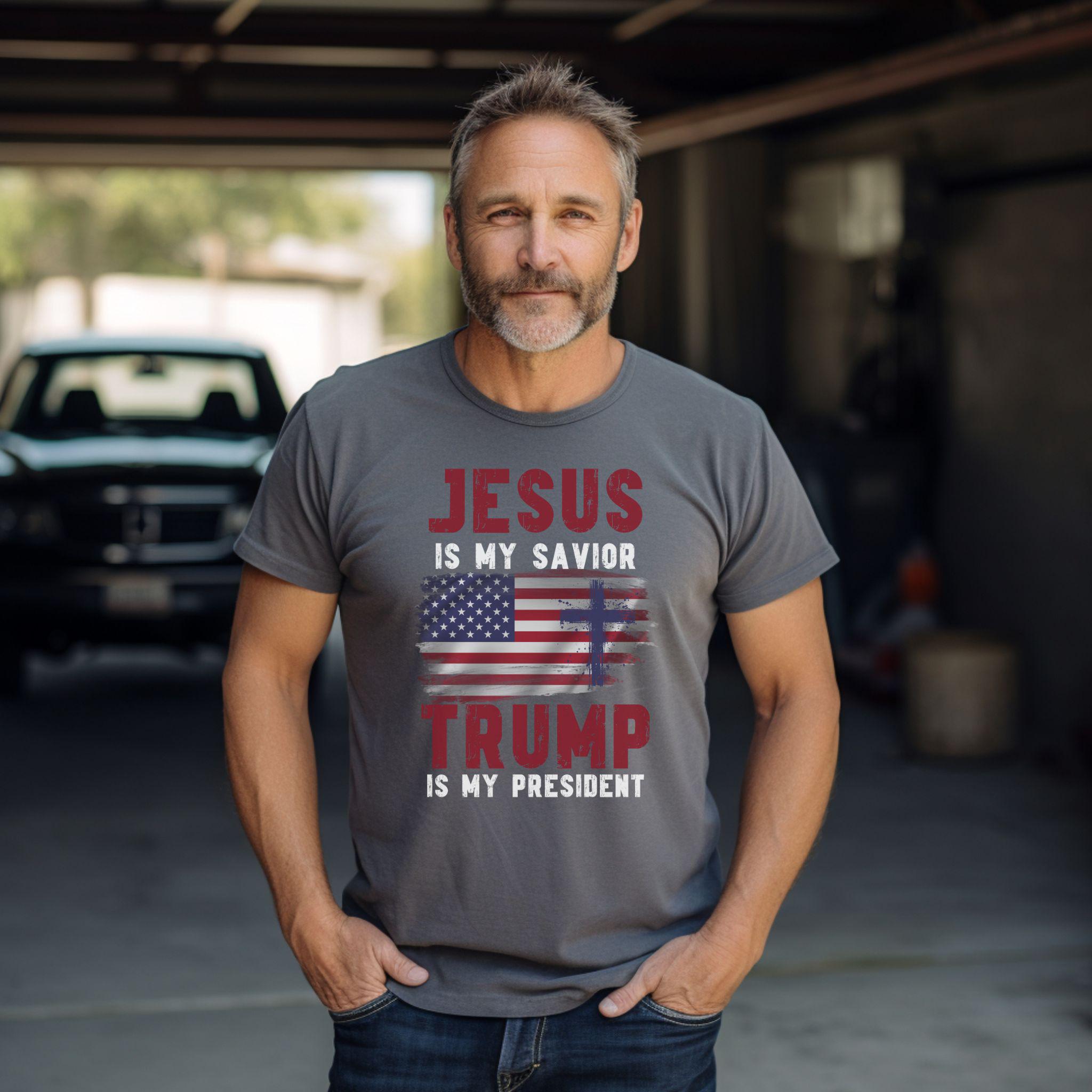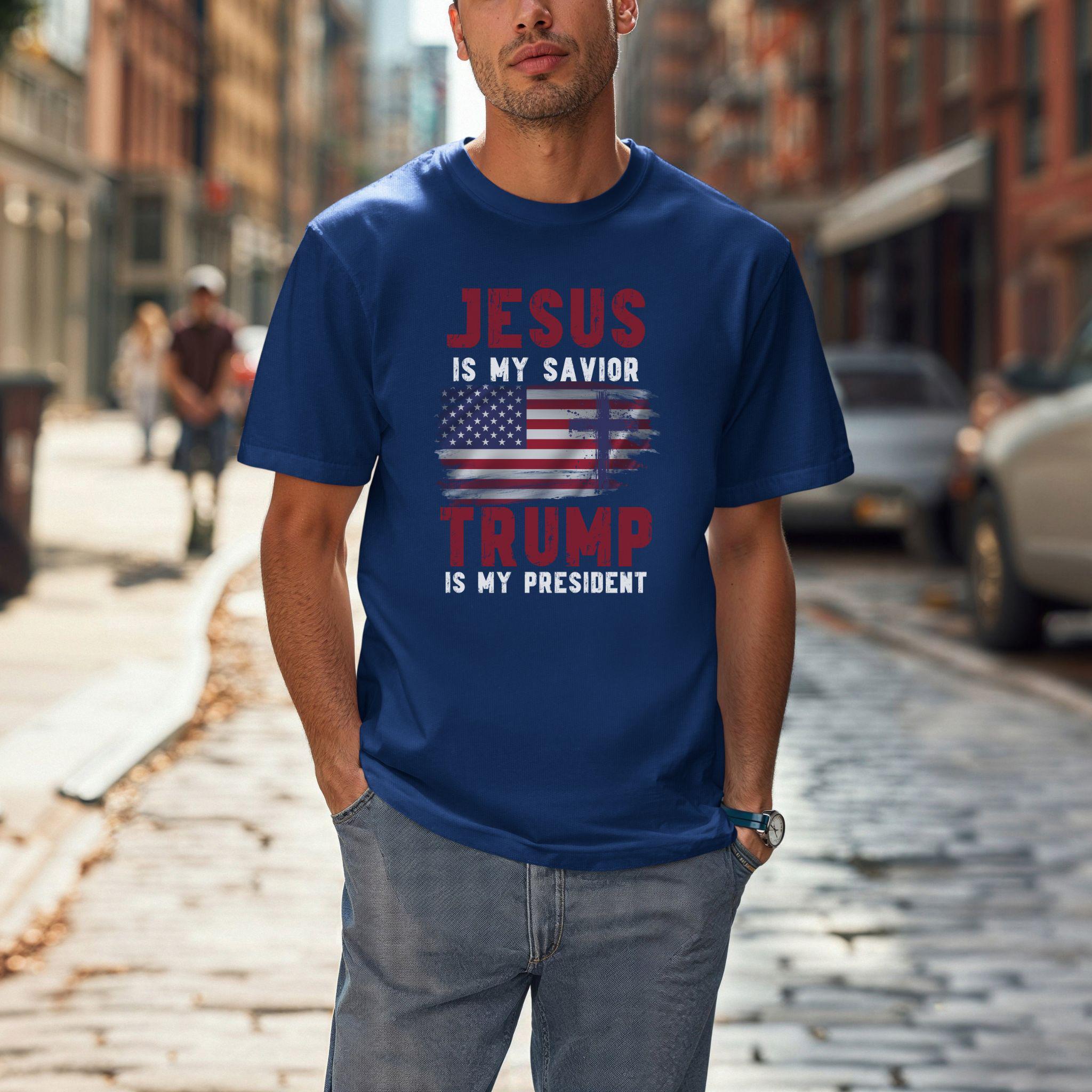 Show off your faith and political stance with our bold “Jesus Is My Savior, Trump Is My President” t-shirt! This striking design features a distressed American flag and powerful text in white, purple, and red. Perfect for those who proudly stand by their beliefs, this shirt is a great conversation starter and a unique addition to your wardrobe. Made from soft, high-quality fabric, it’s comfortable for everyday wear. Whether you’re attending a rally, a church event, or just hanging out with friends, this t-shirt is sure to make a statement.