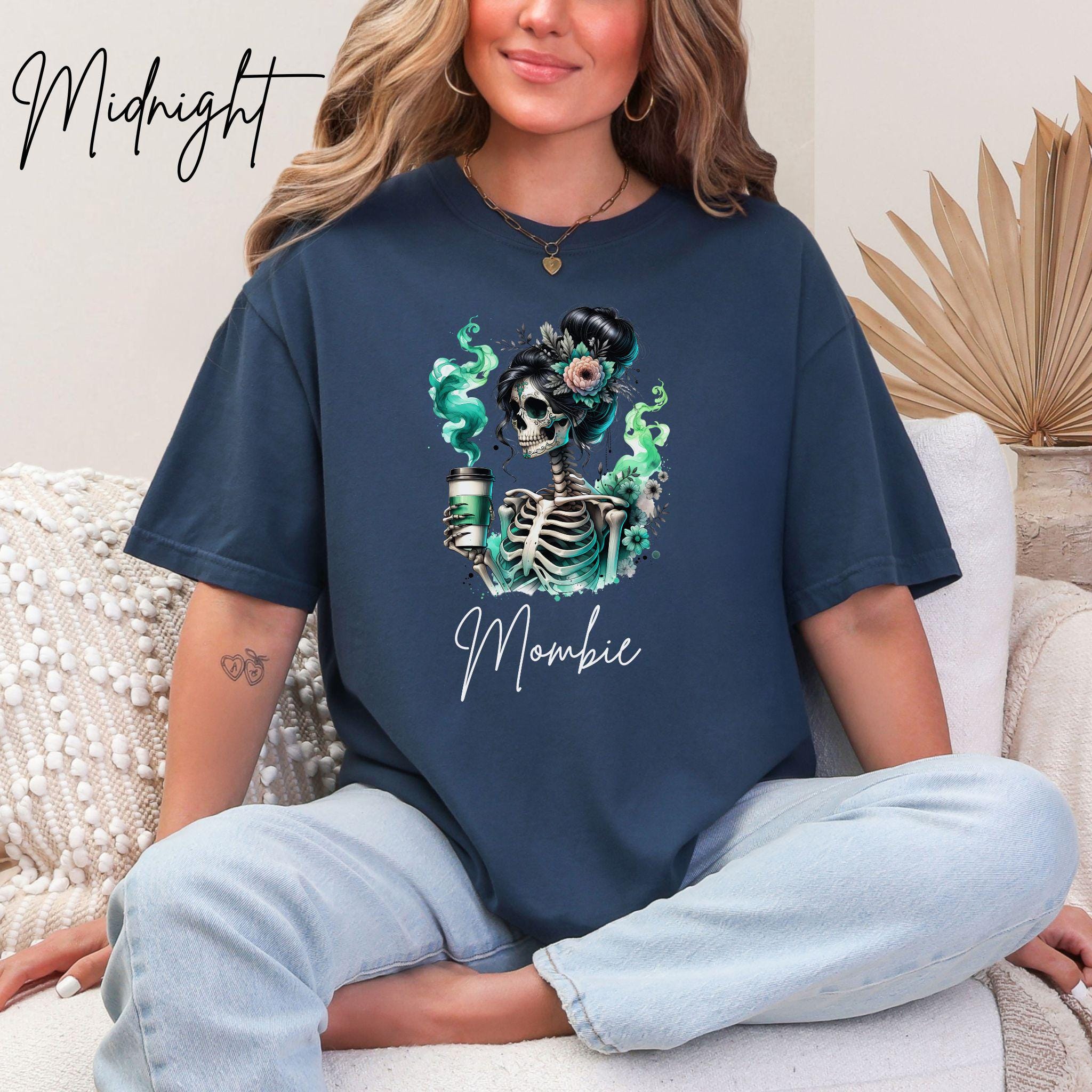 The Mombie Tee is made for every mom who runs on caffeine, chaos, and a little bit of spooky magic. Featuring a hauntingly beautiful skeleton mama wrapped in florals and swirling green smoke, this shirt blends eerie Halloween vibes with boutique charm. It’s the perfect mix of playful and stylish—because mom life doesn’t stop when October rolls around, and neither does your coffee cup.