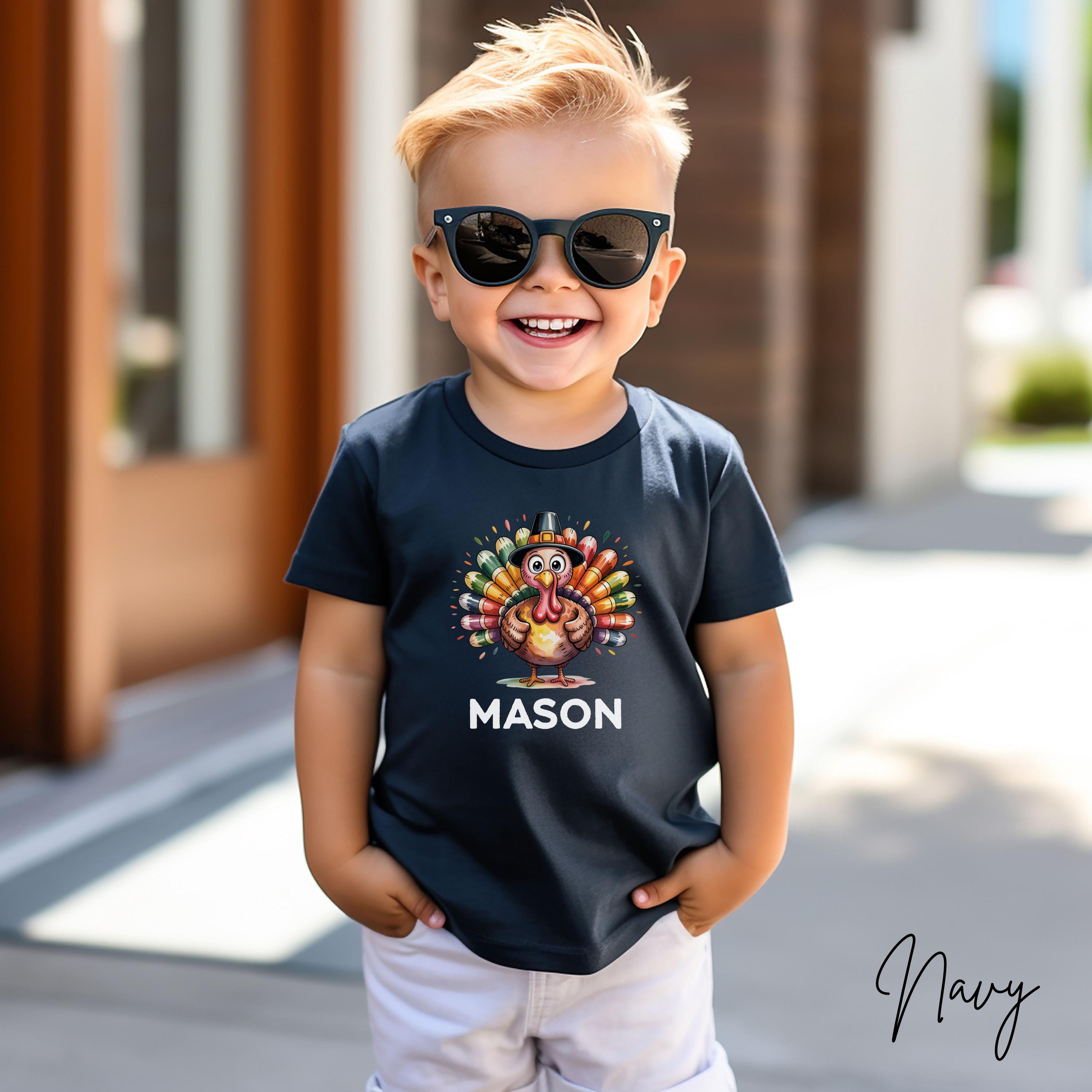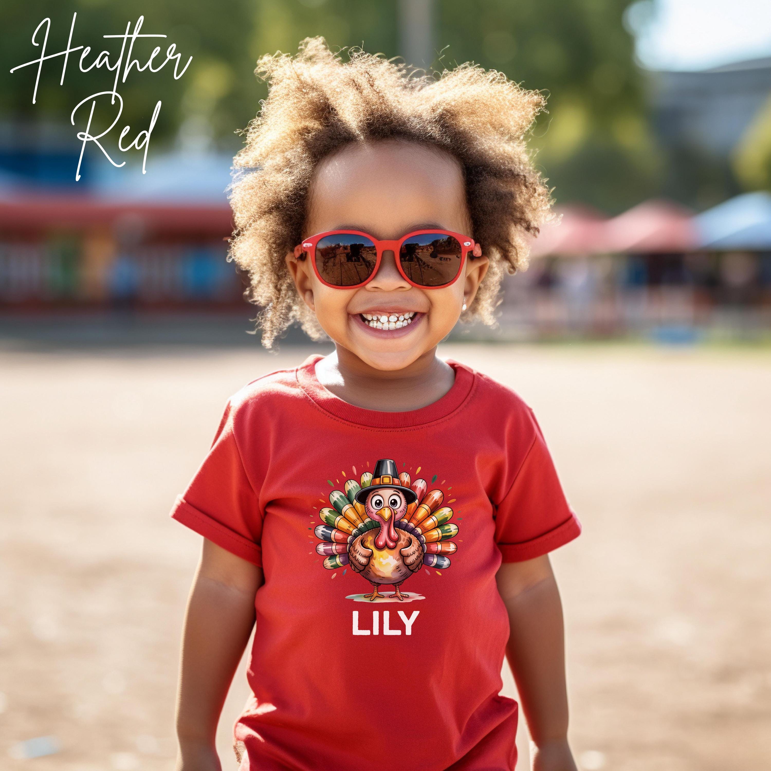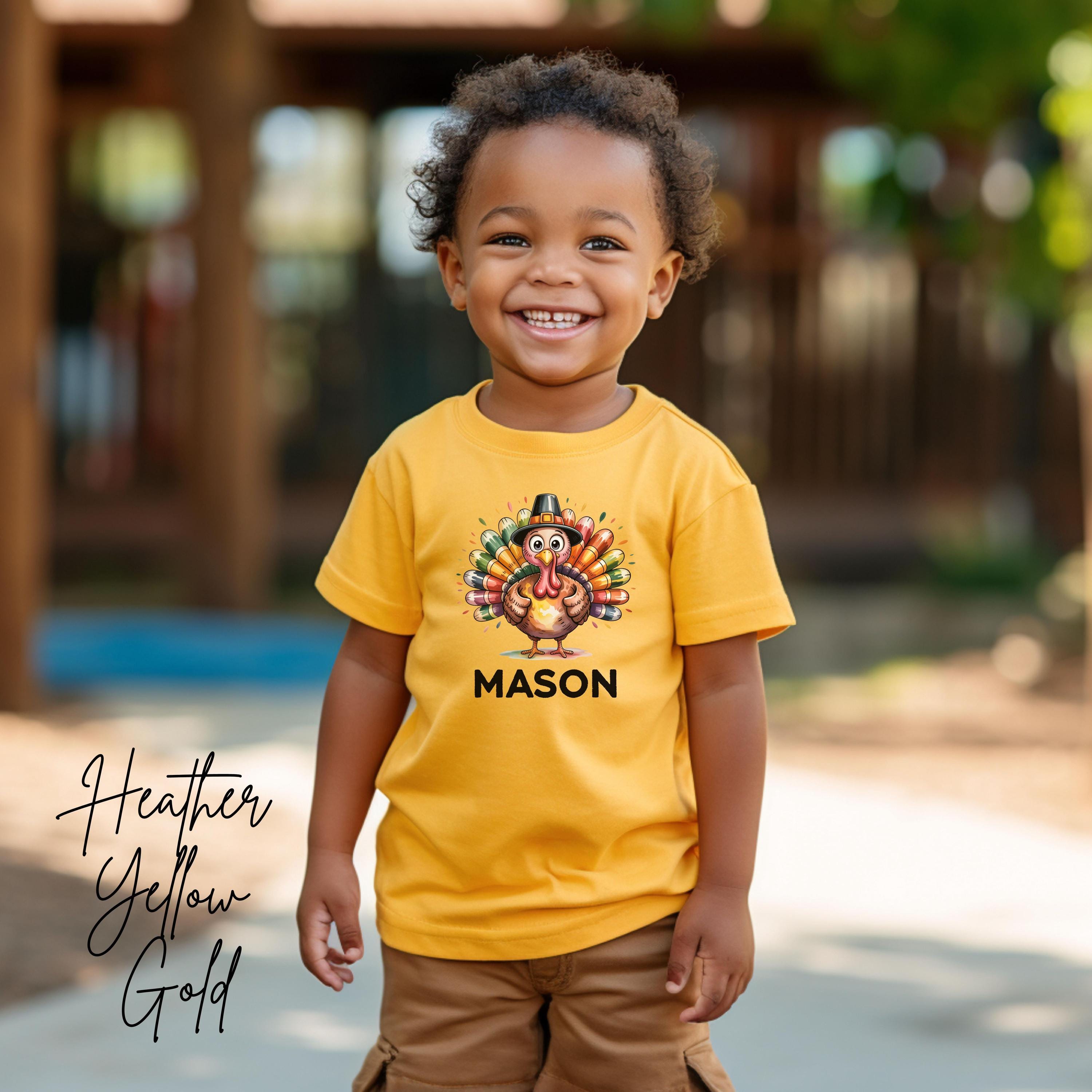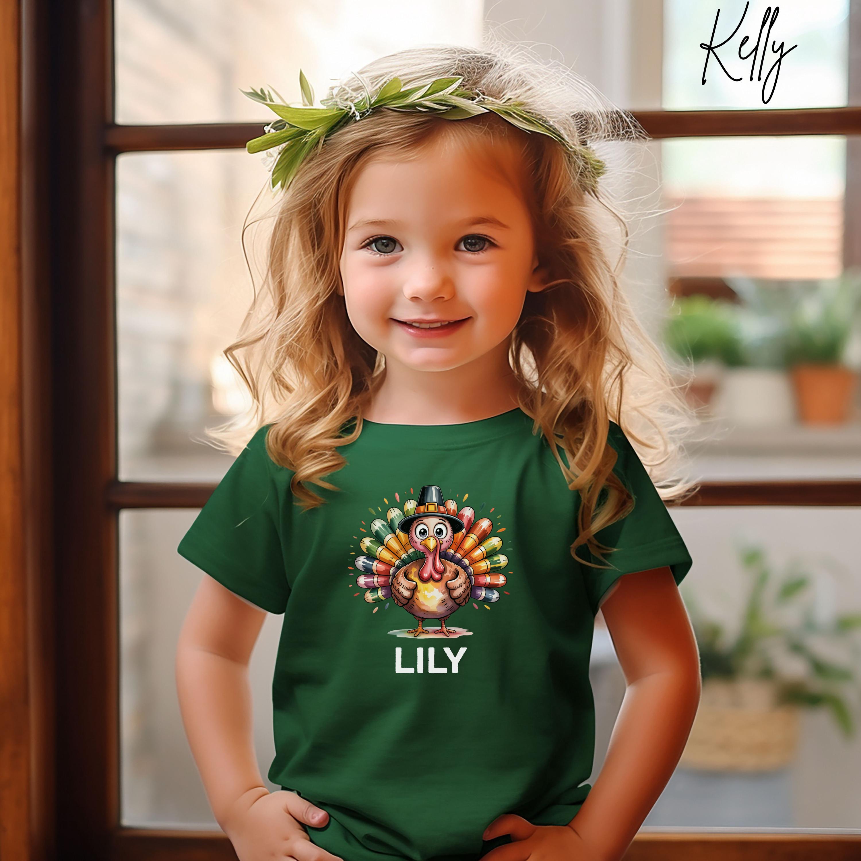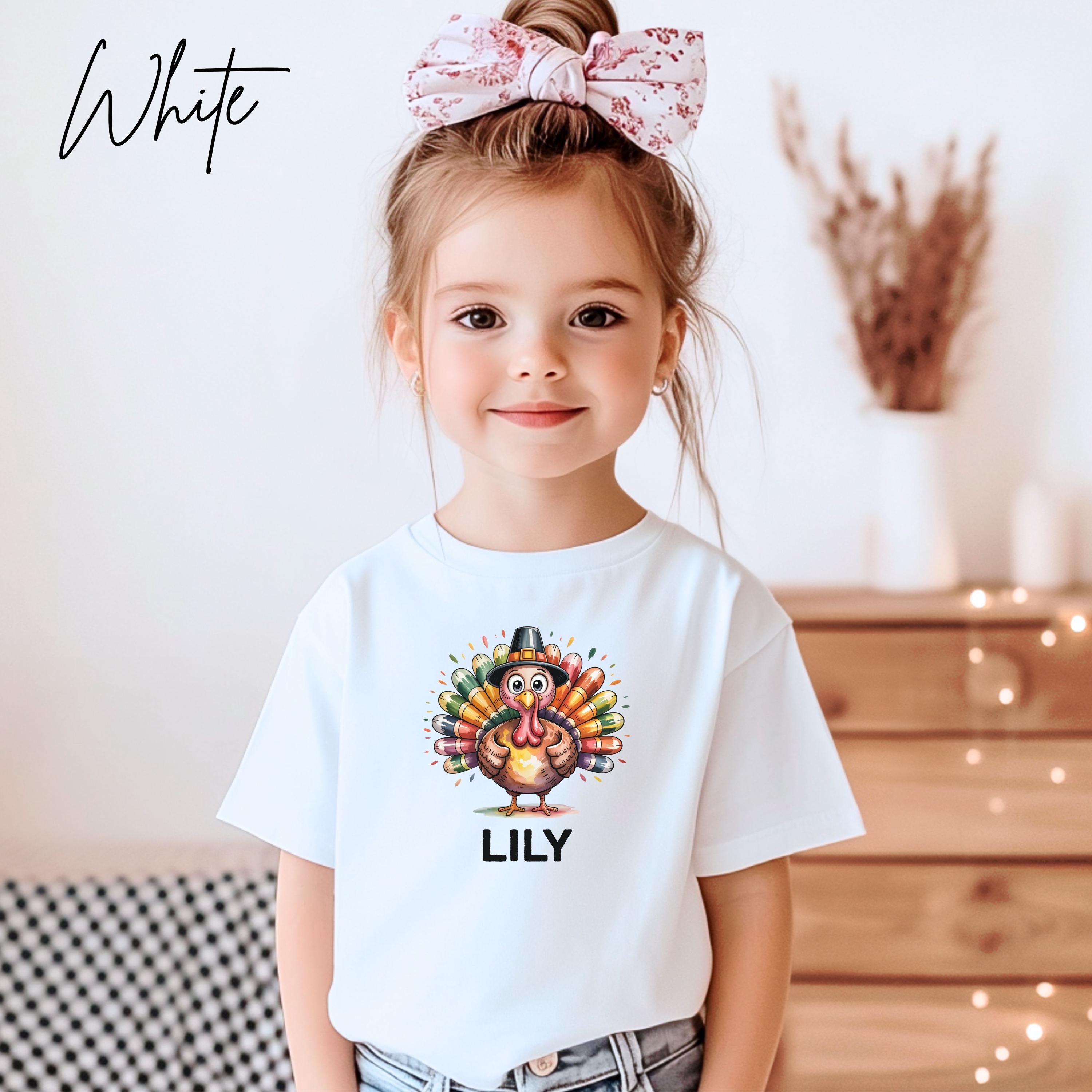 Celebrate fall with this personalized Thanksgiving t-shirt featuring a colorful watercolor-style turkey and bold name print. Designed for festive family gatherings, school parties, and seasonal snapshots, this soft white tee brings handcrafted charm and playful personality to your little one’s holiday wardrobe.