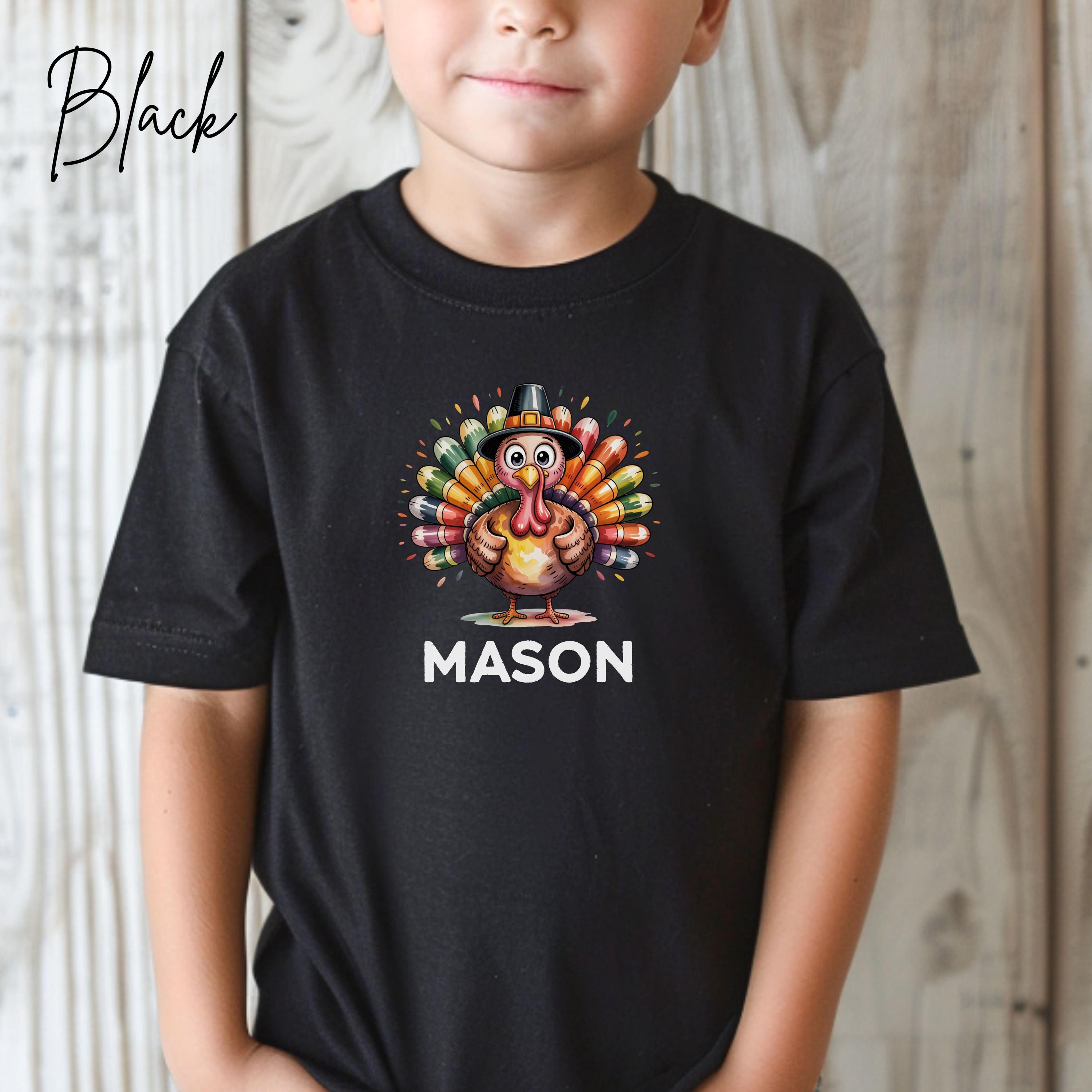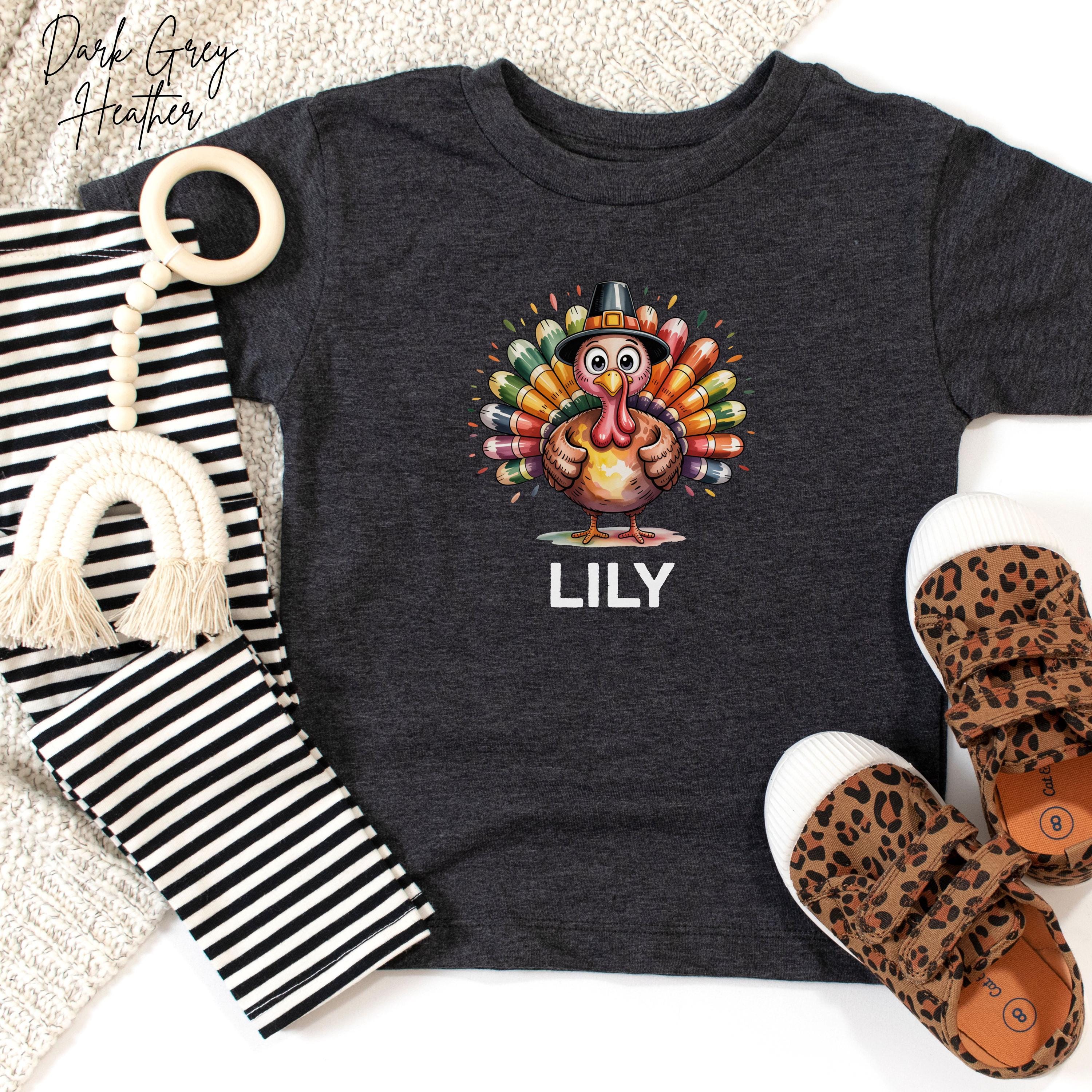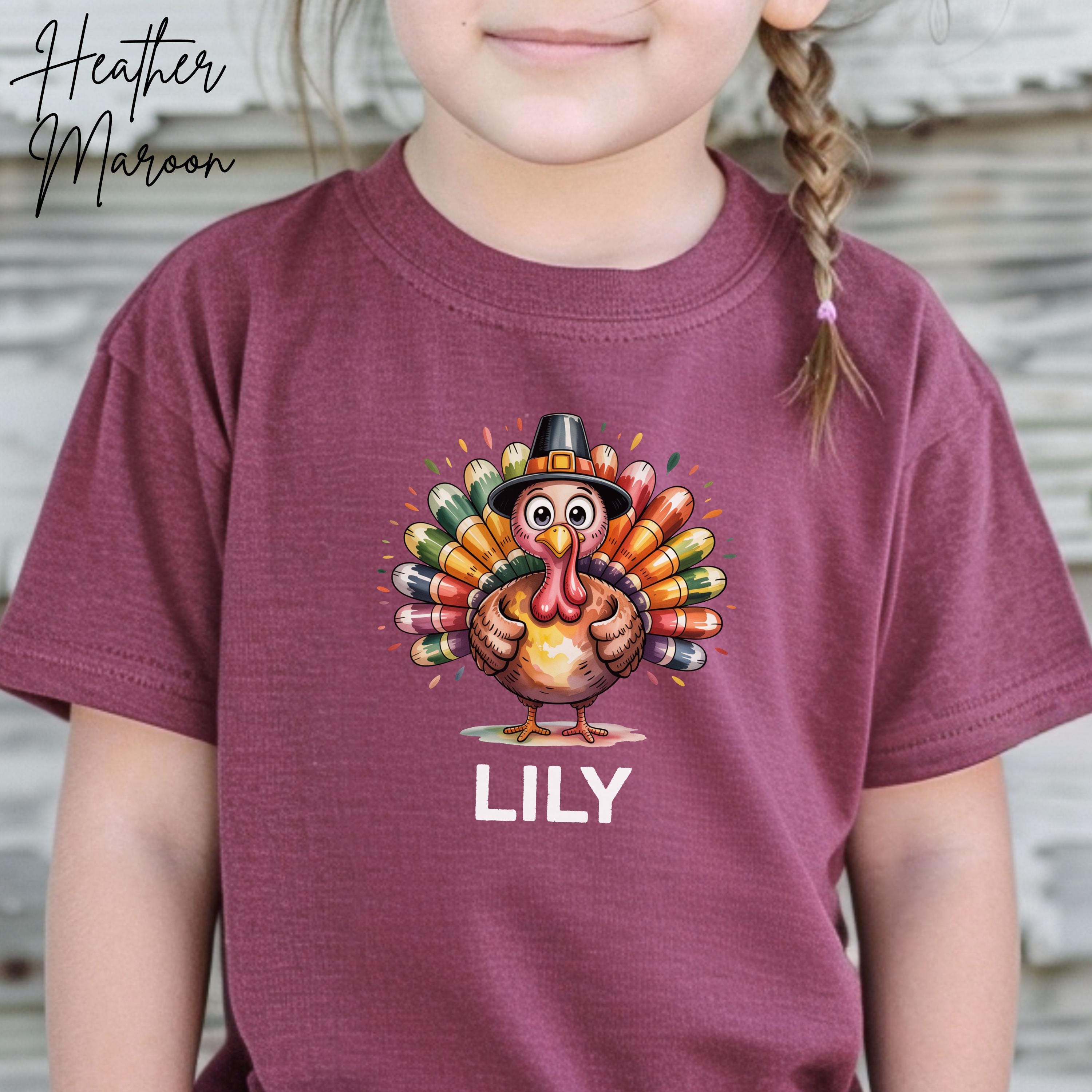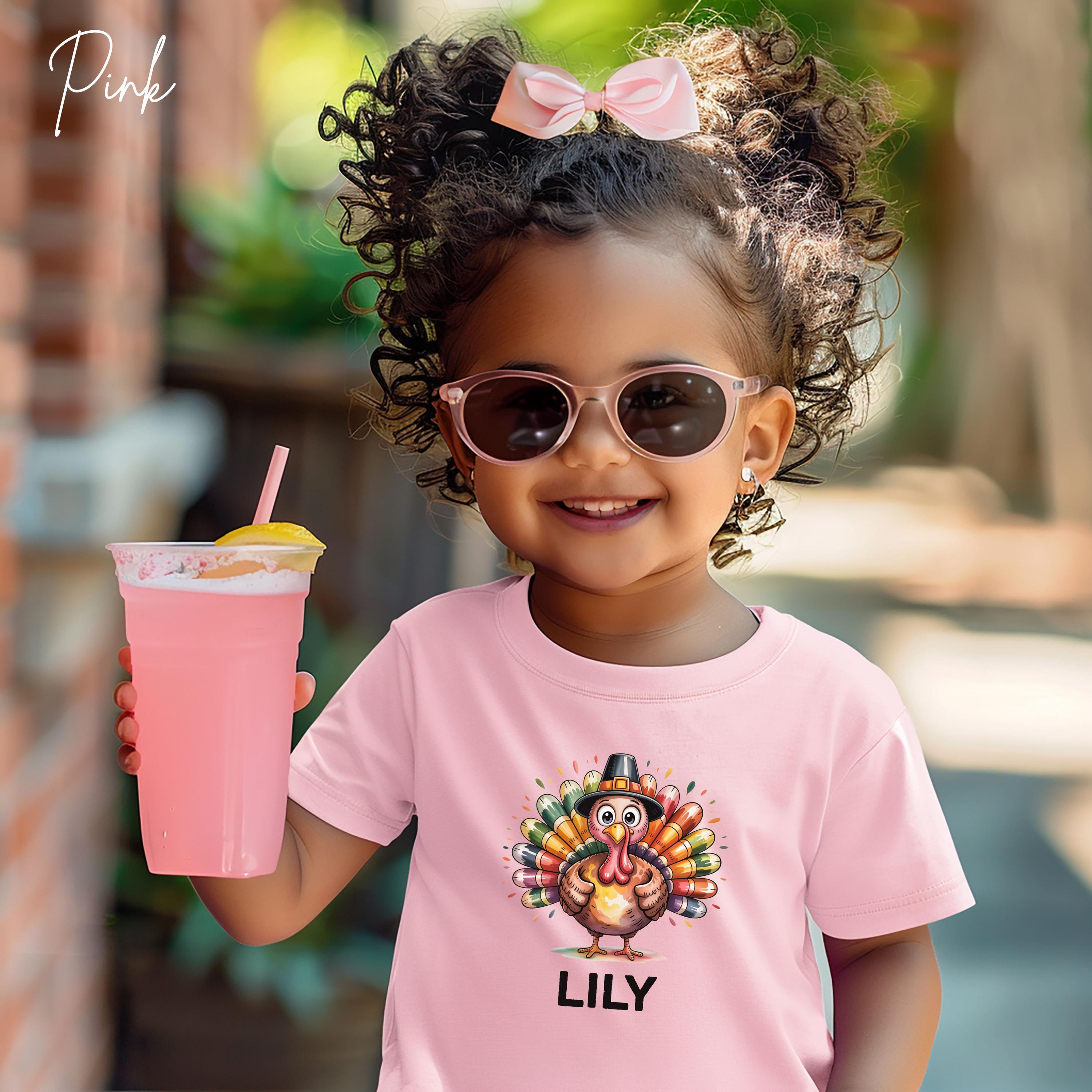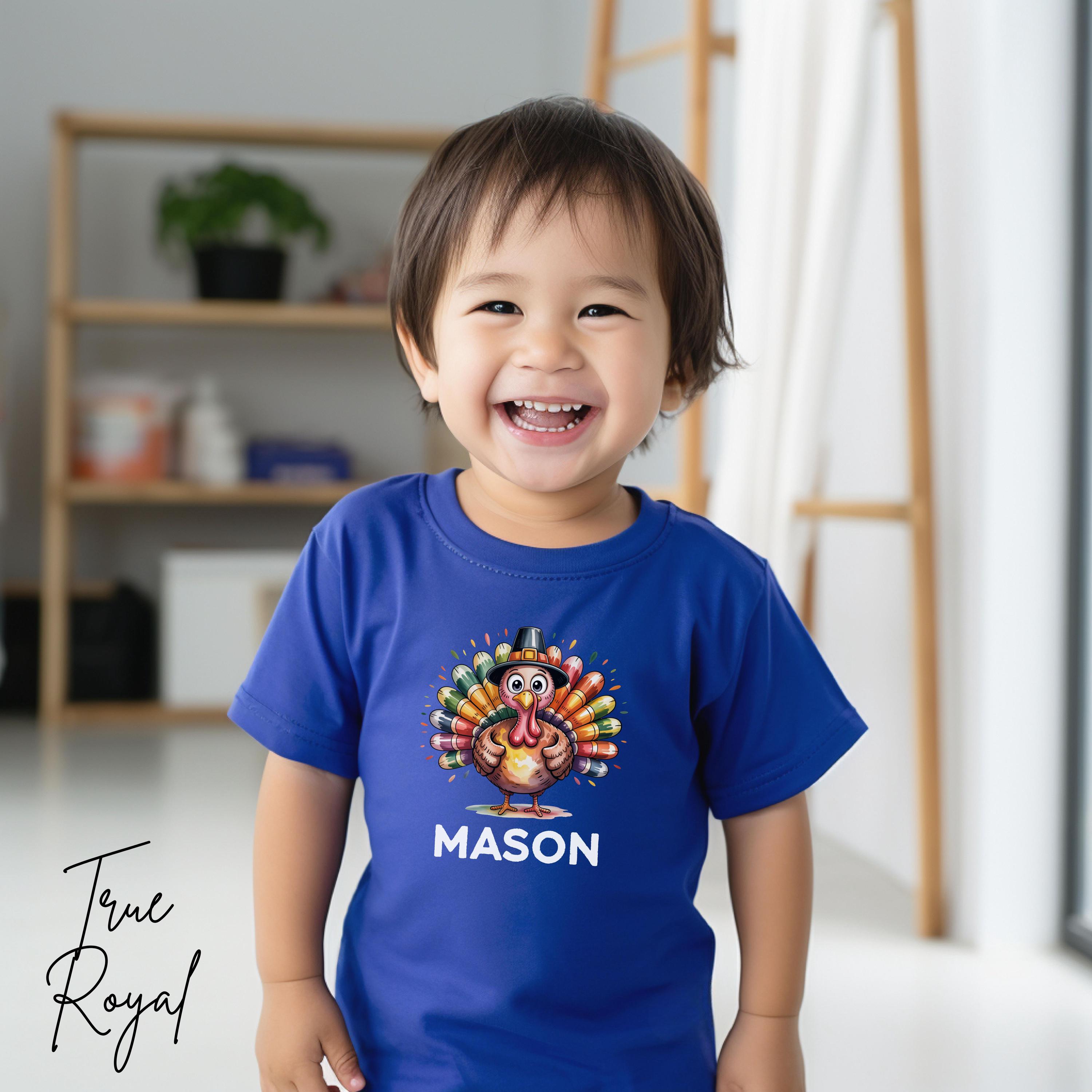 Celebrate fall with this personalized Thanksgiving t-shirt featuring a colorful watercolor-style turkey and bold name print. Designed for festive family gatherings, school parties, and seasonal snapshots, this soft white tee brings handcrafted charm and playful personality to your little one’s holiday wardrobe.