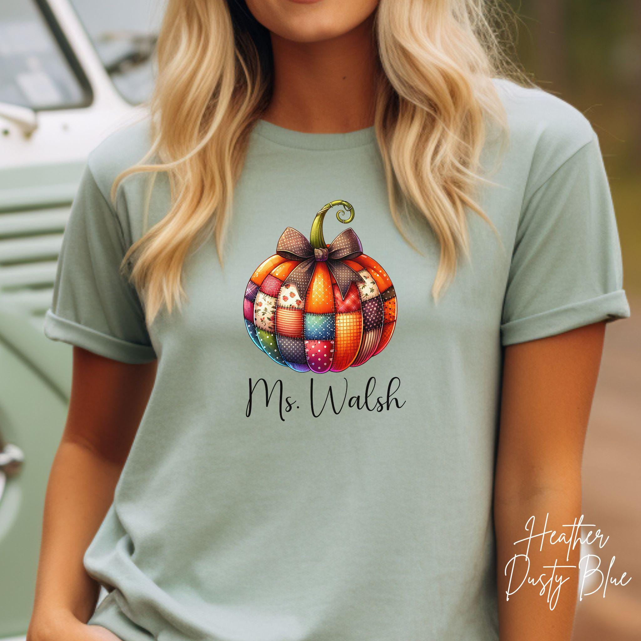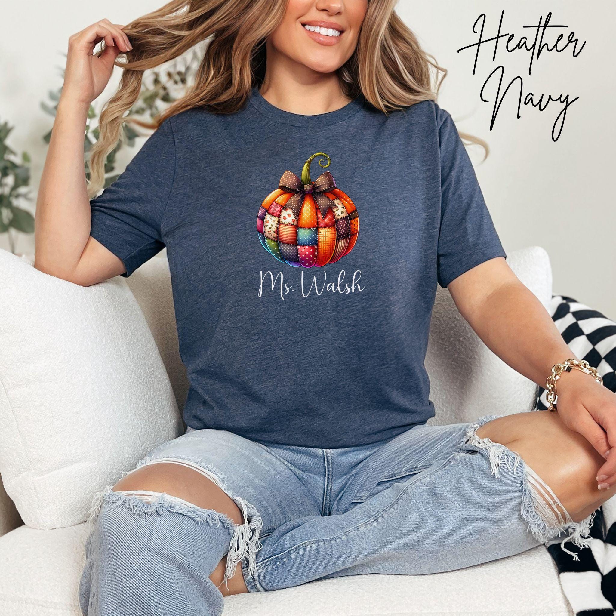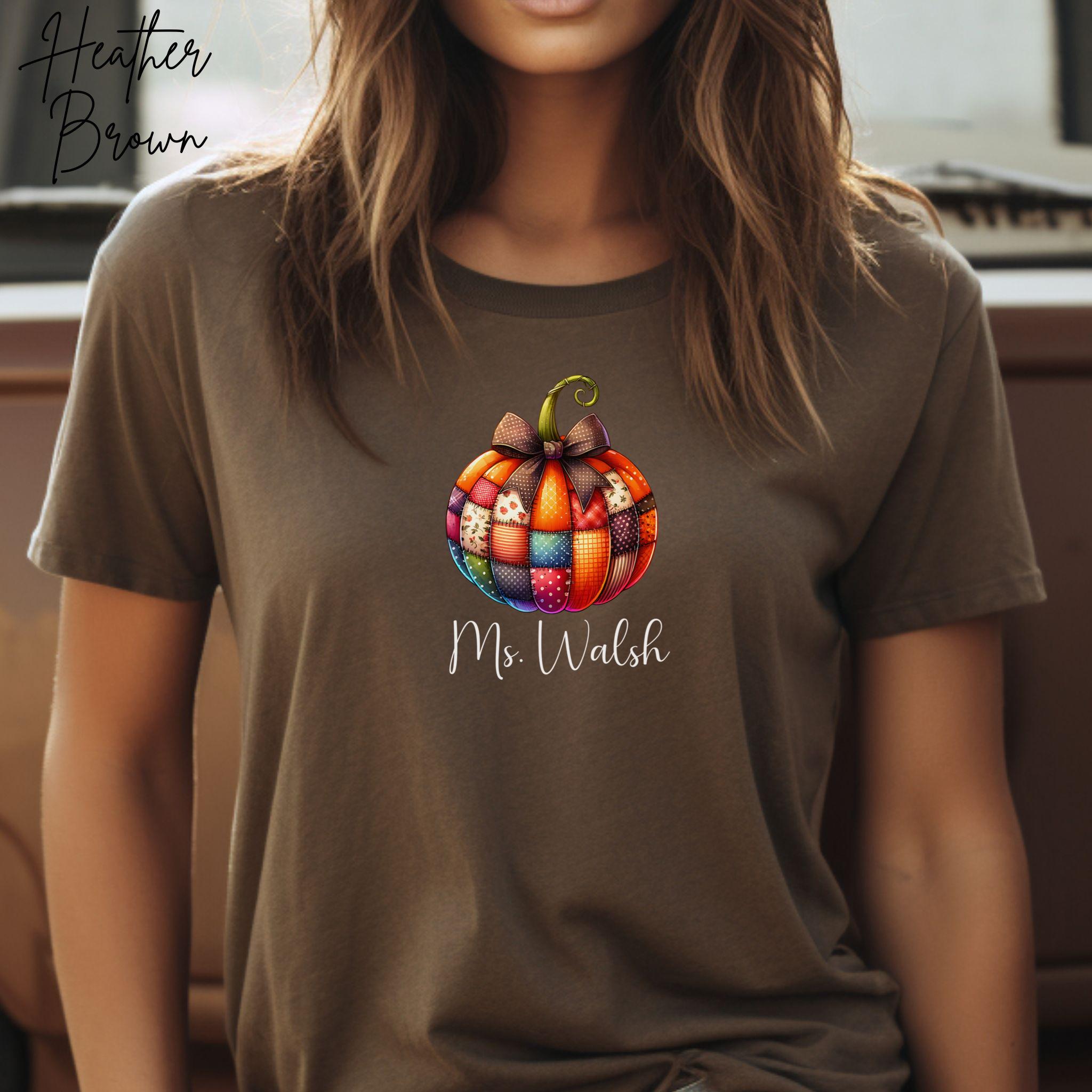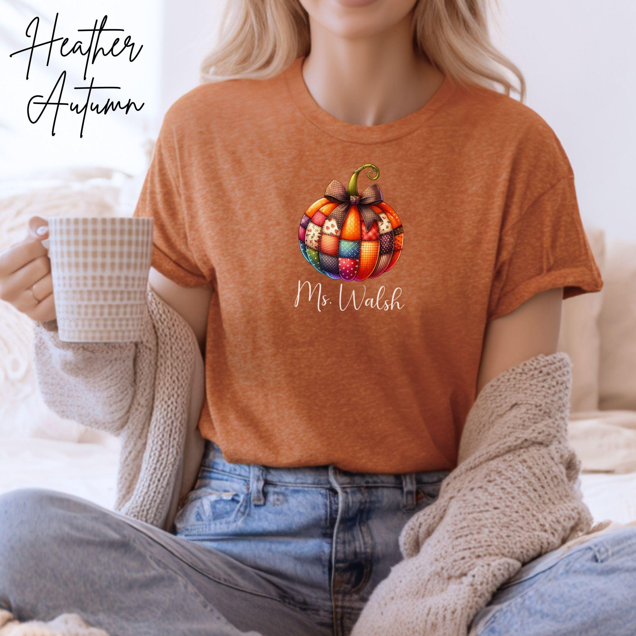 Celebrate the cozy vibes of fall with this personalized patchwork pumpkin shirt, perfect for teachers, moms, or anyone who loves autumn style! The design features a charming pumpkin made of patterned segments—plaid, polka dots, and florals—topped with a sweet bow and customized with your name in elegant script.