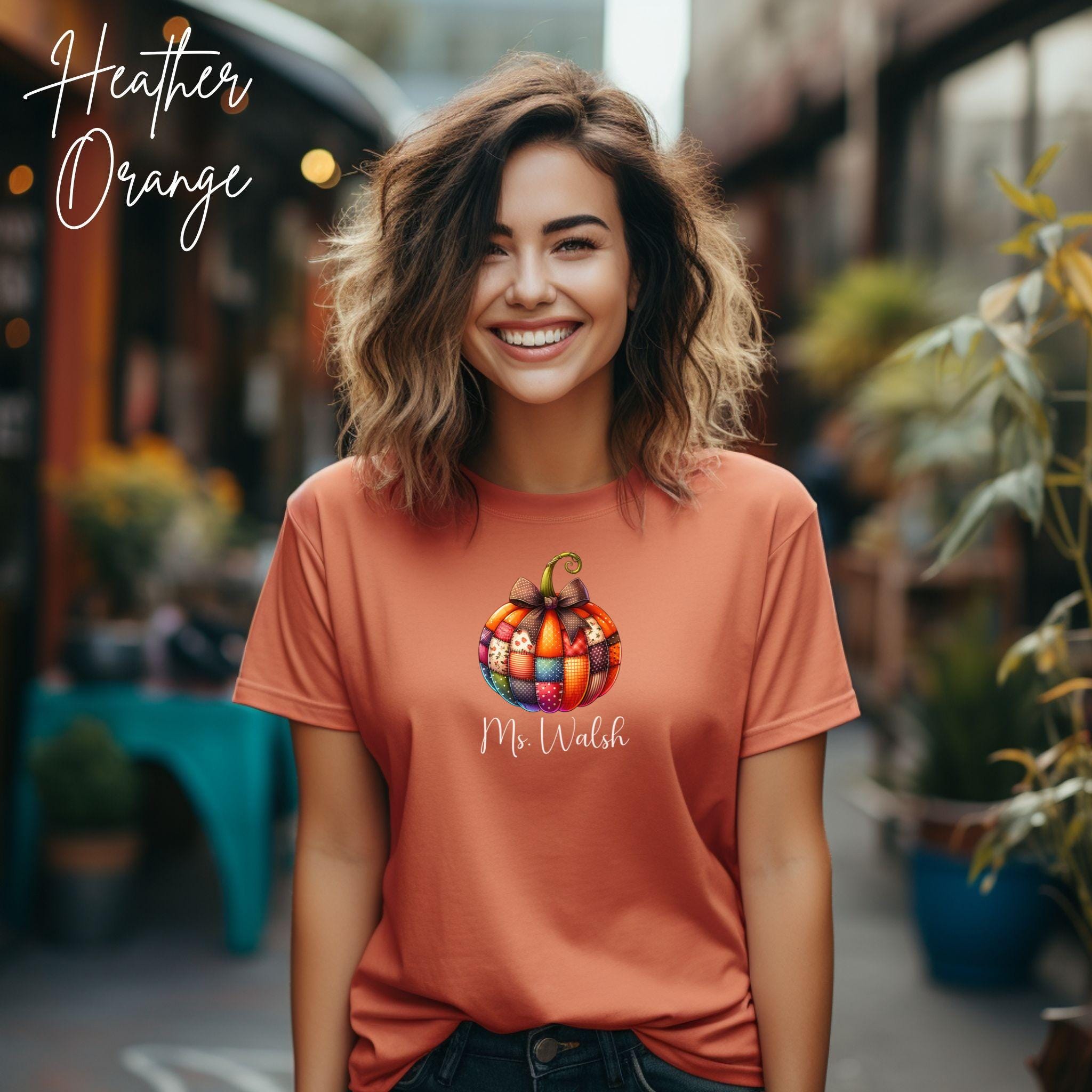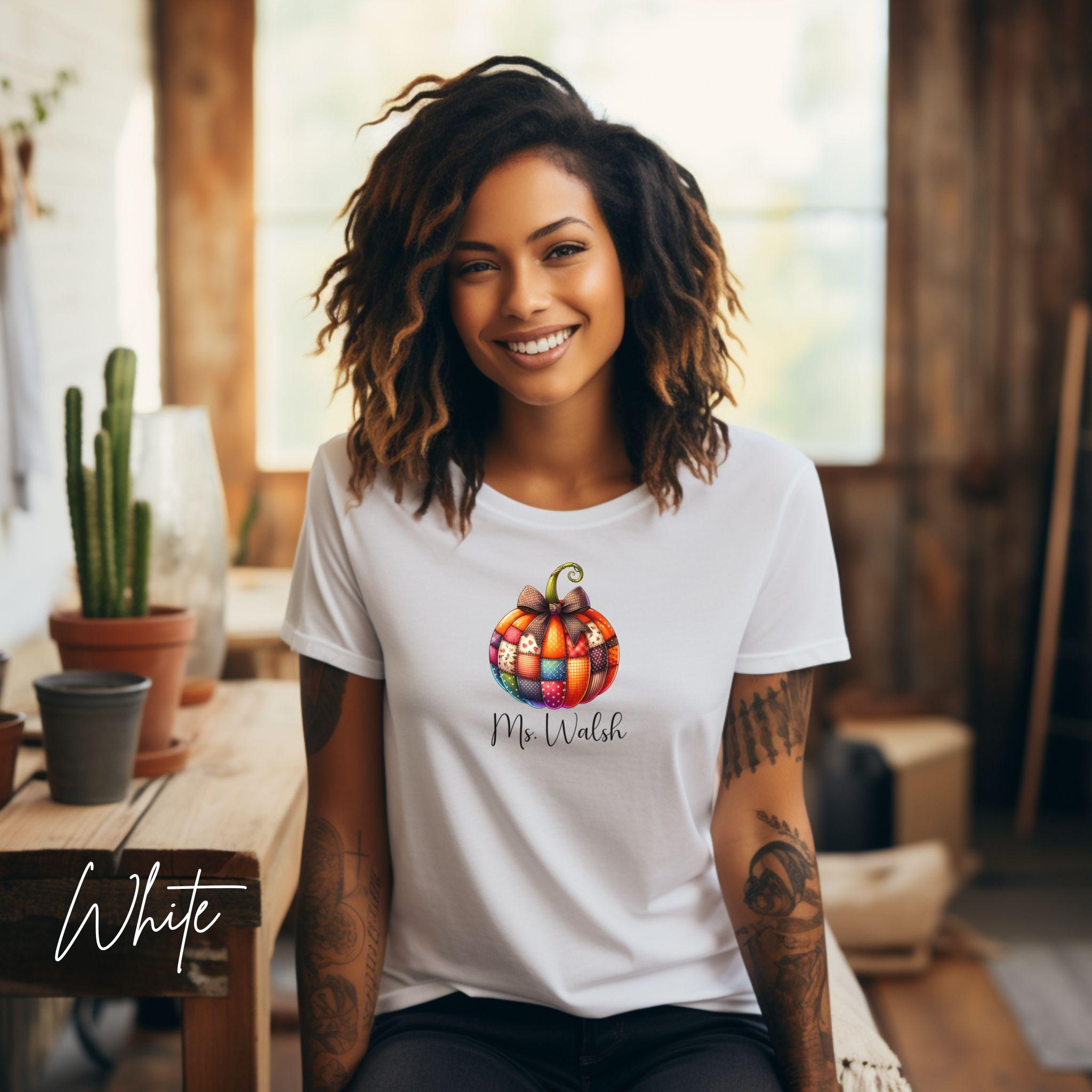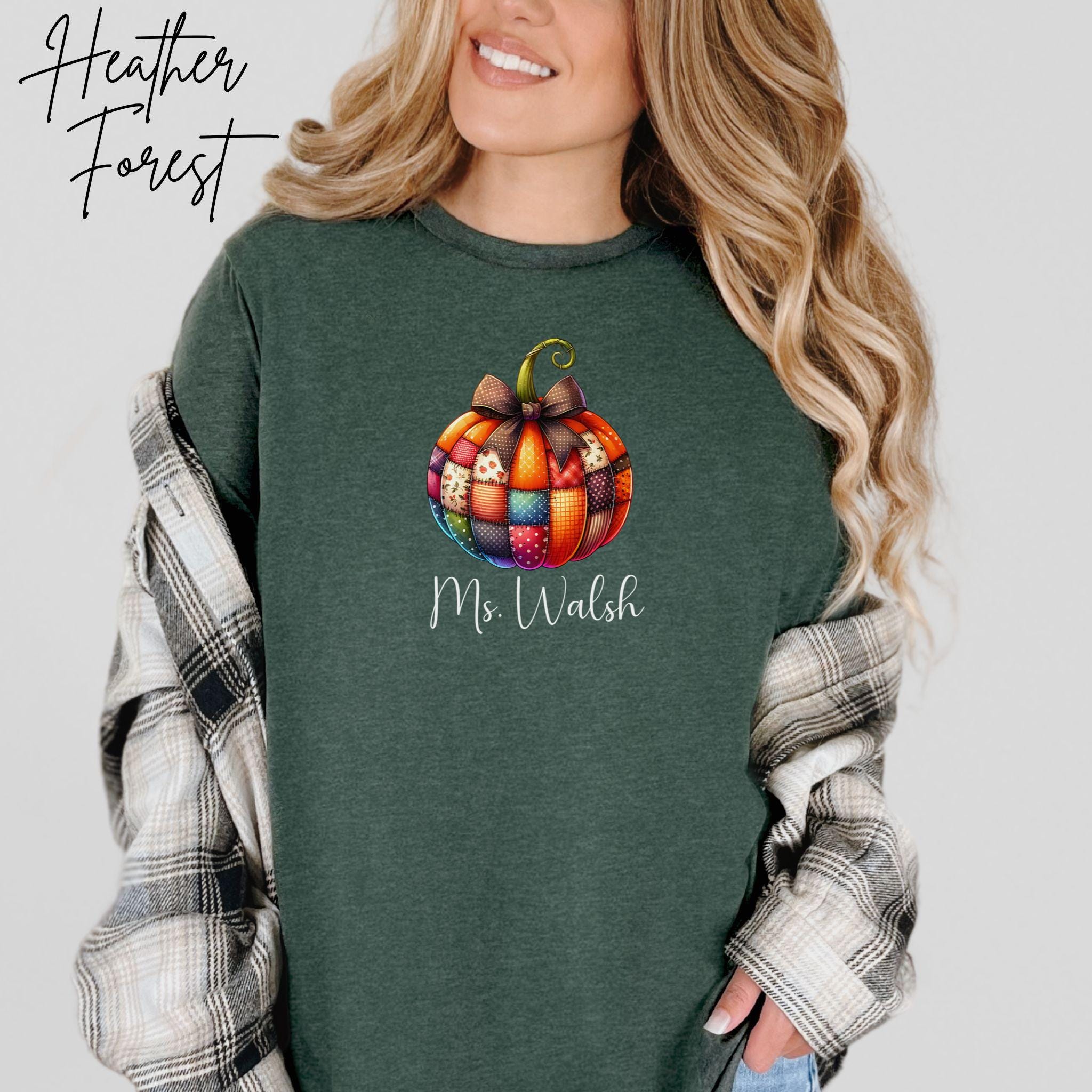 Celebrate the cozy vibes of fall with this personalized patchwork pumpkin shirt, perfect for teachers, moms, or anyone who loves autumn style! The design features a charming pumpkin made of patterned segments—plaid, polka dots, and florals—topped with a sweet bow and customized with your name in elegant script.
