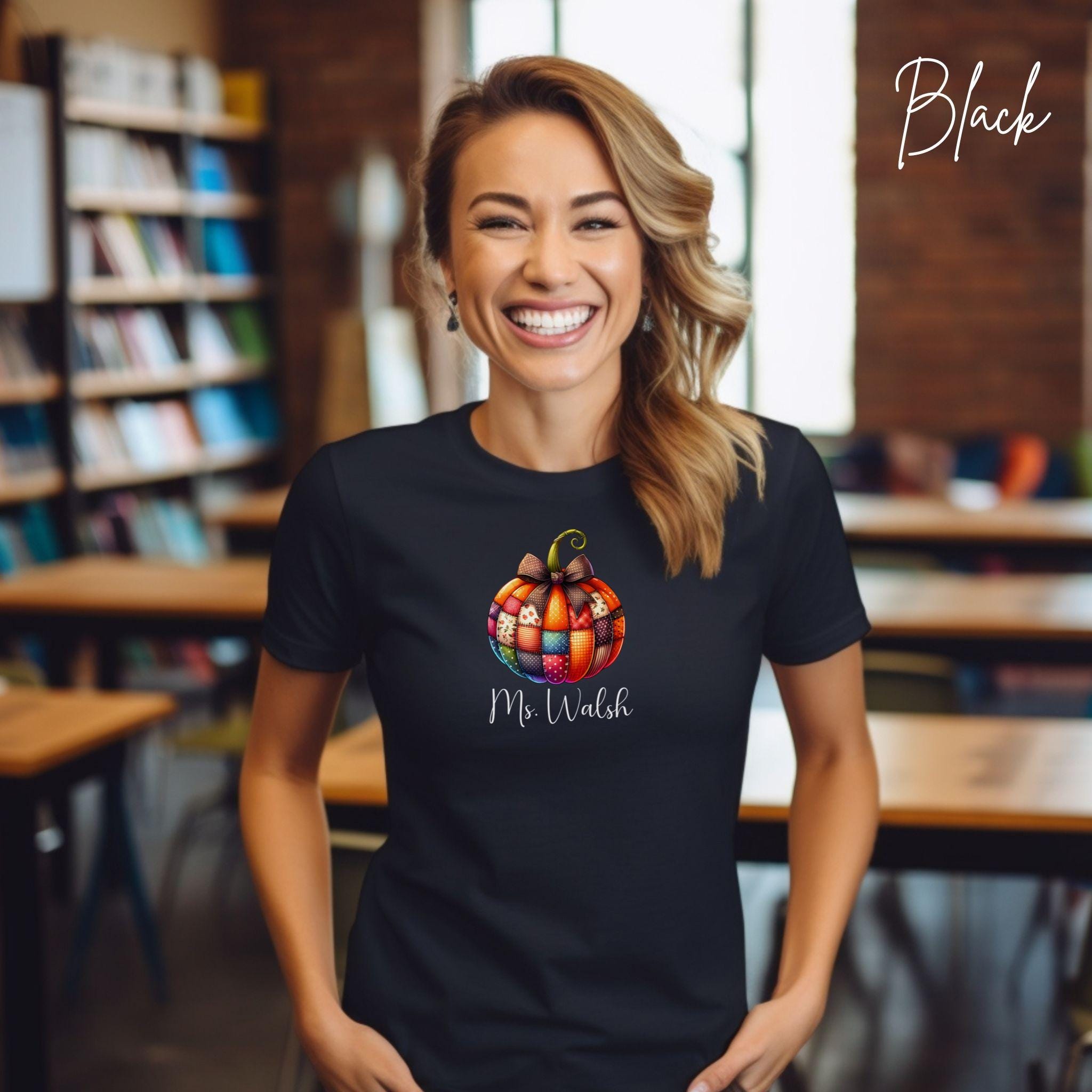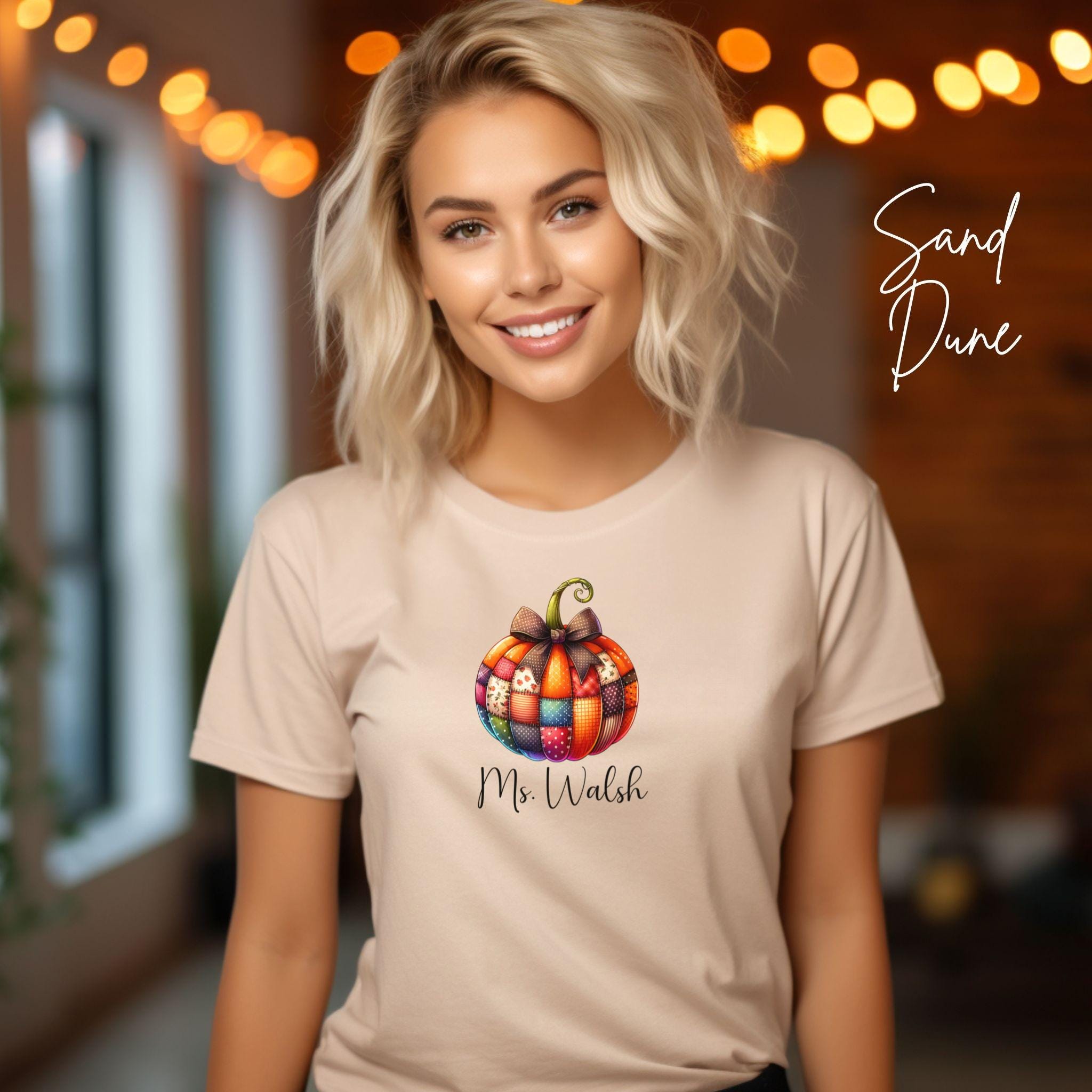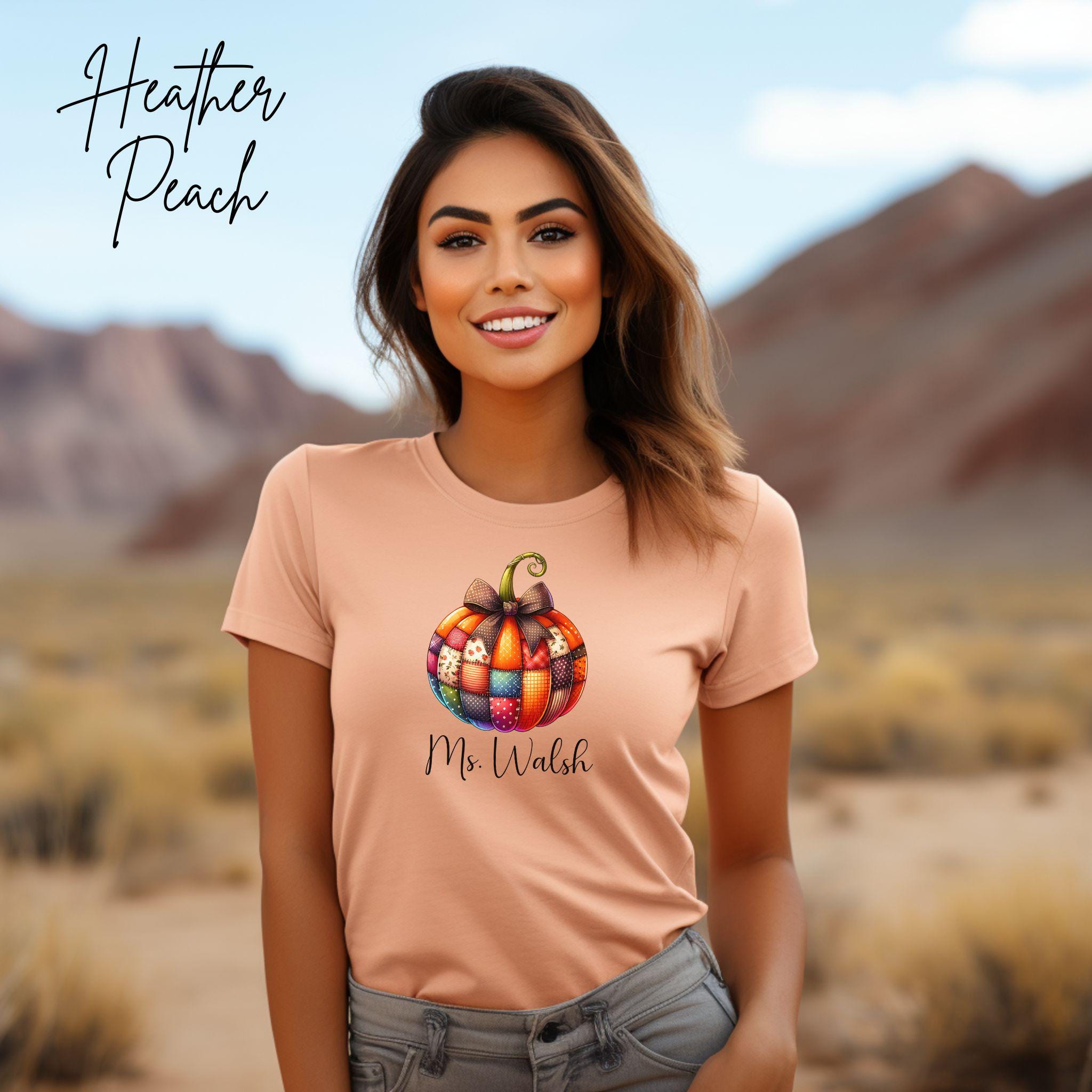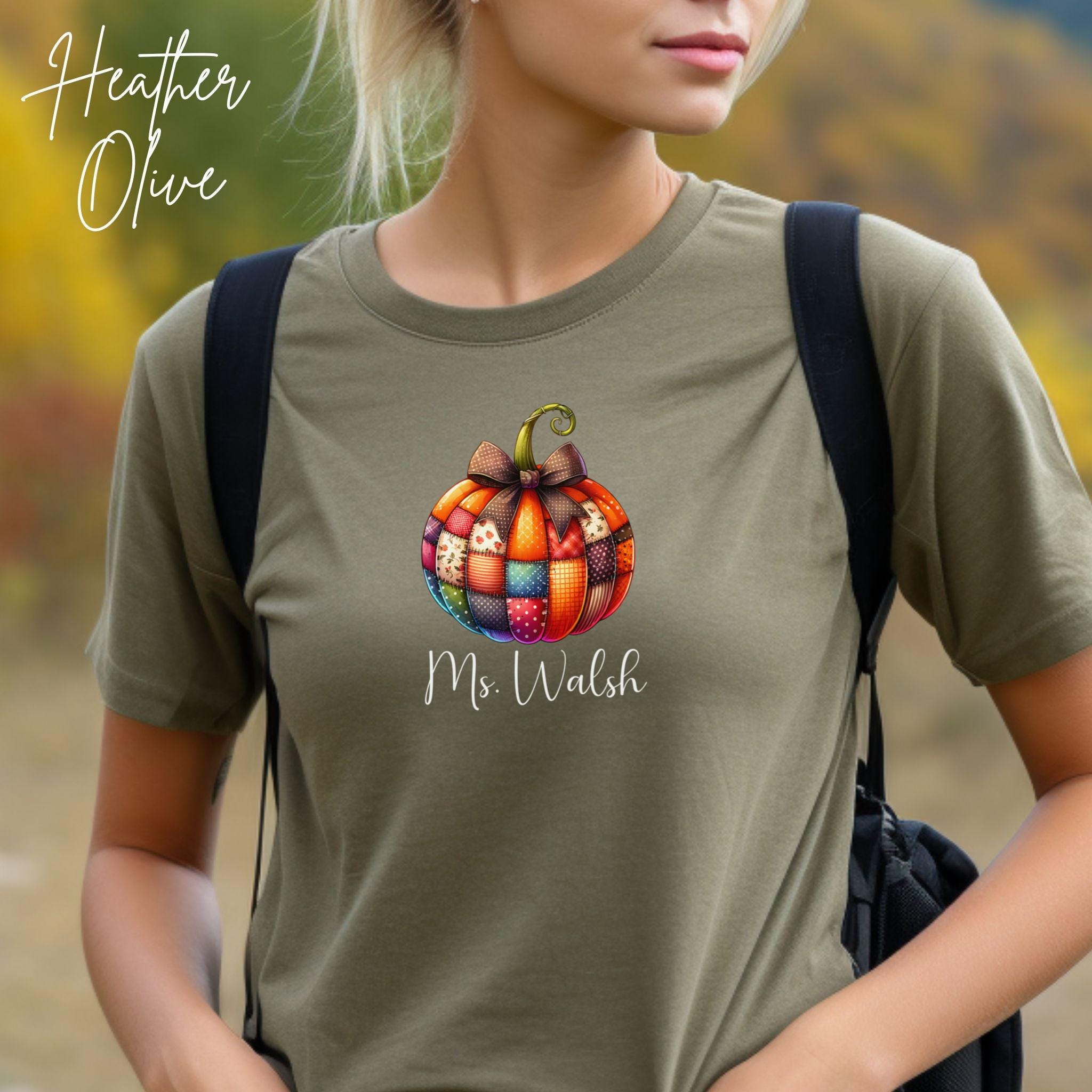 Celebrate the cozy vibes of fall with this personalized patchwork pumpkin shirt, perfect for teachers, moms, or anyone who loves autumn style! The design features a charming pumpkin made of patterned segments—plaid, polka dots, and florals—topped with a sweet bow and customized with your name in elegant script.