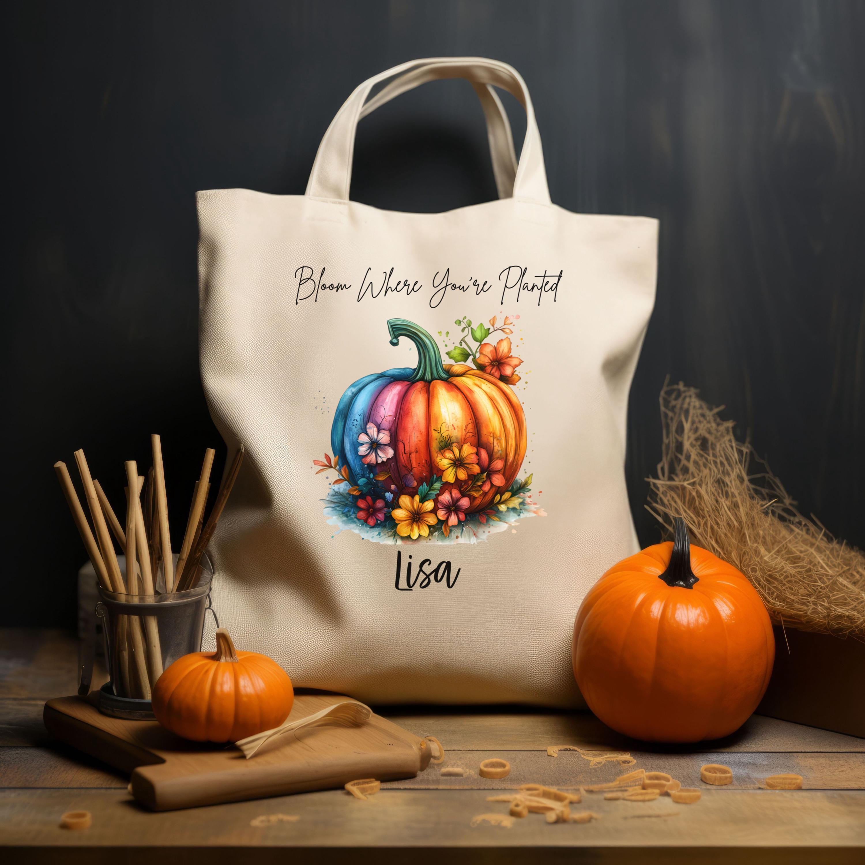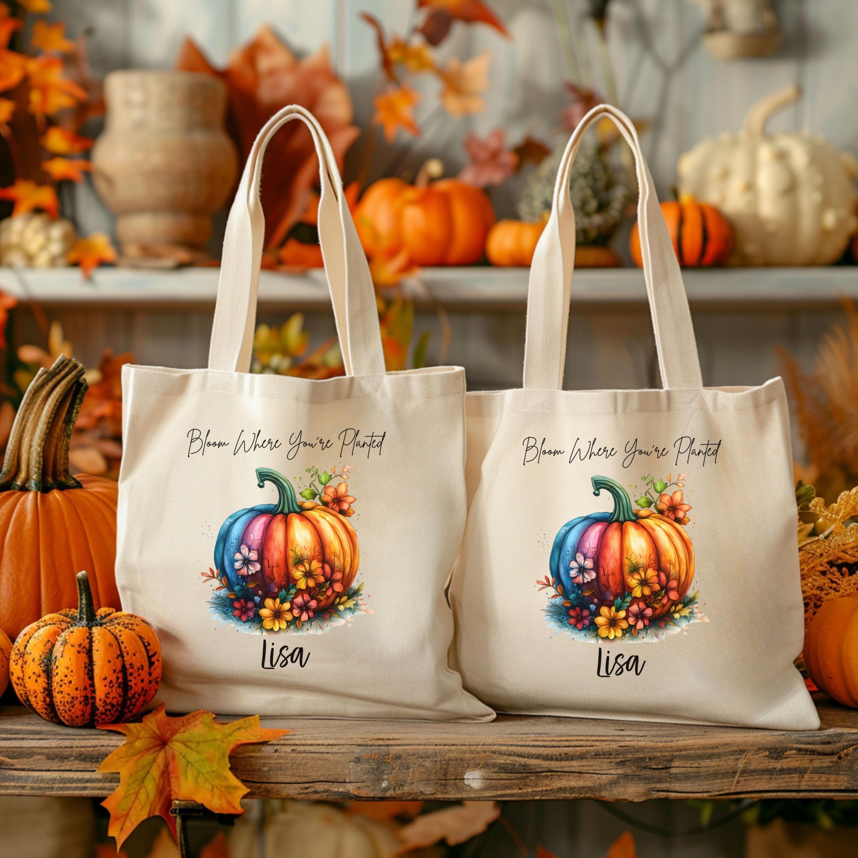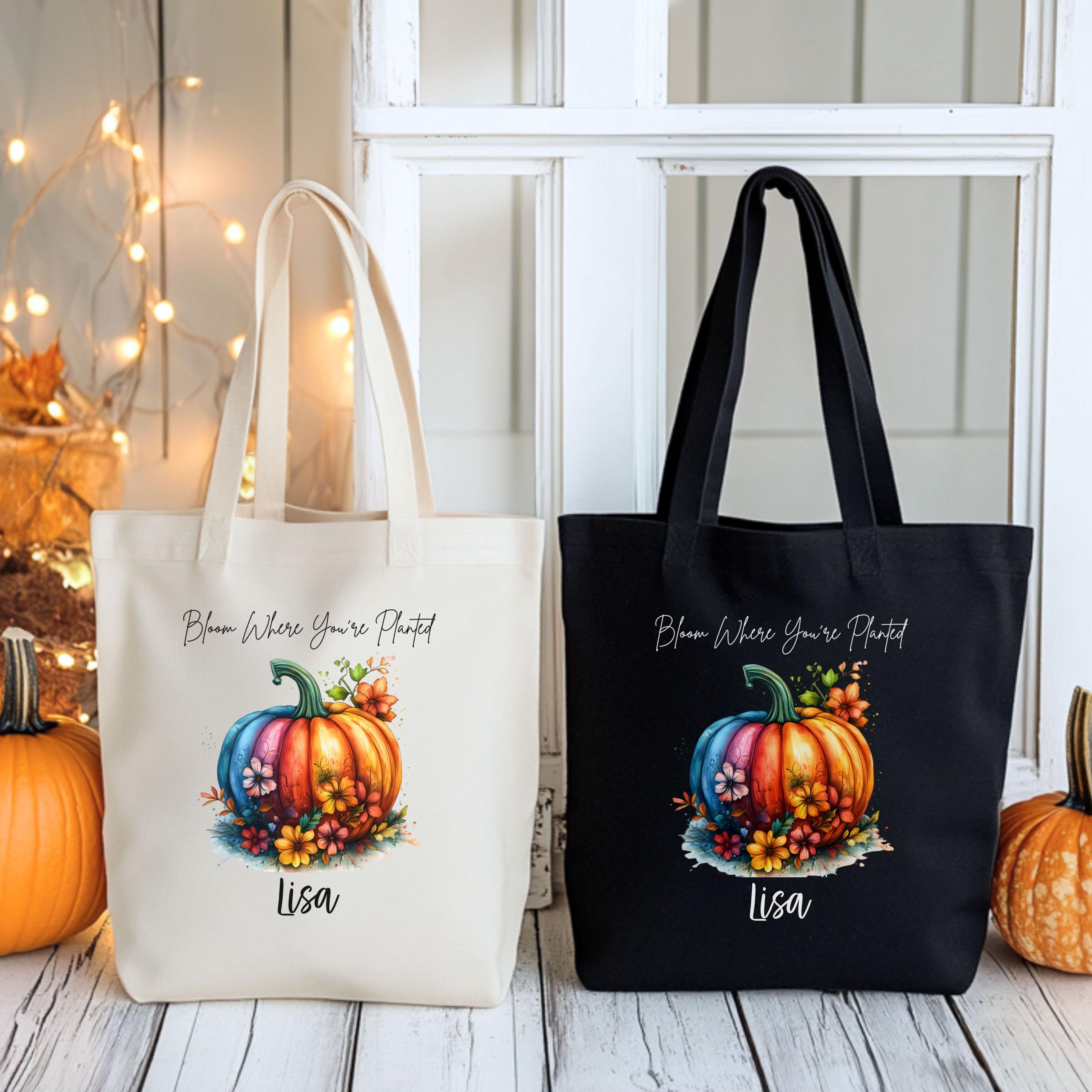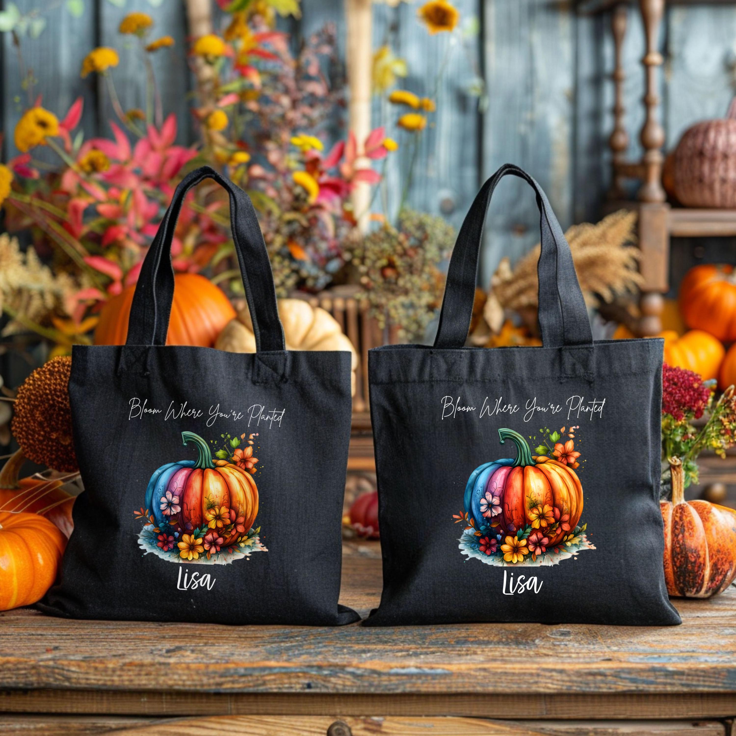 Celebrate cozy season with this personalized fall tote featuring our vibrant “Bloom Where You’re Planted” design. A multicolored pumpkin surrounded by autumn florals pops against your choice of natural or black canvas — perfect for gifting, errands, or seasonal flair.