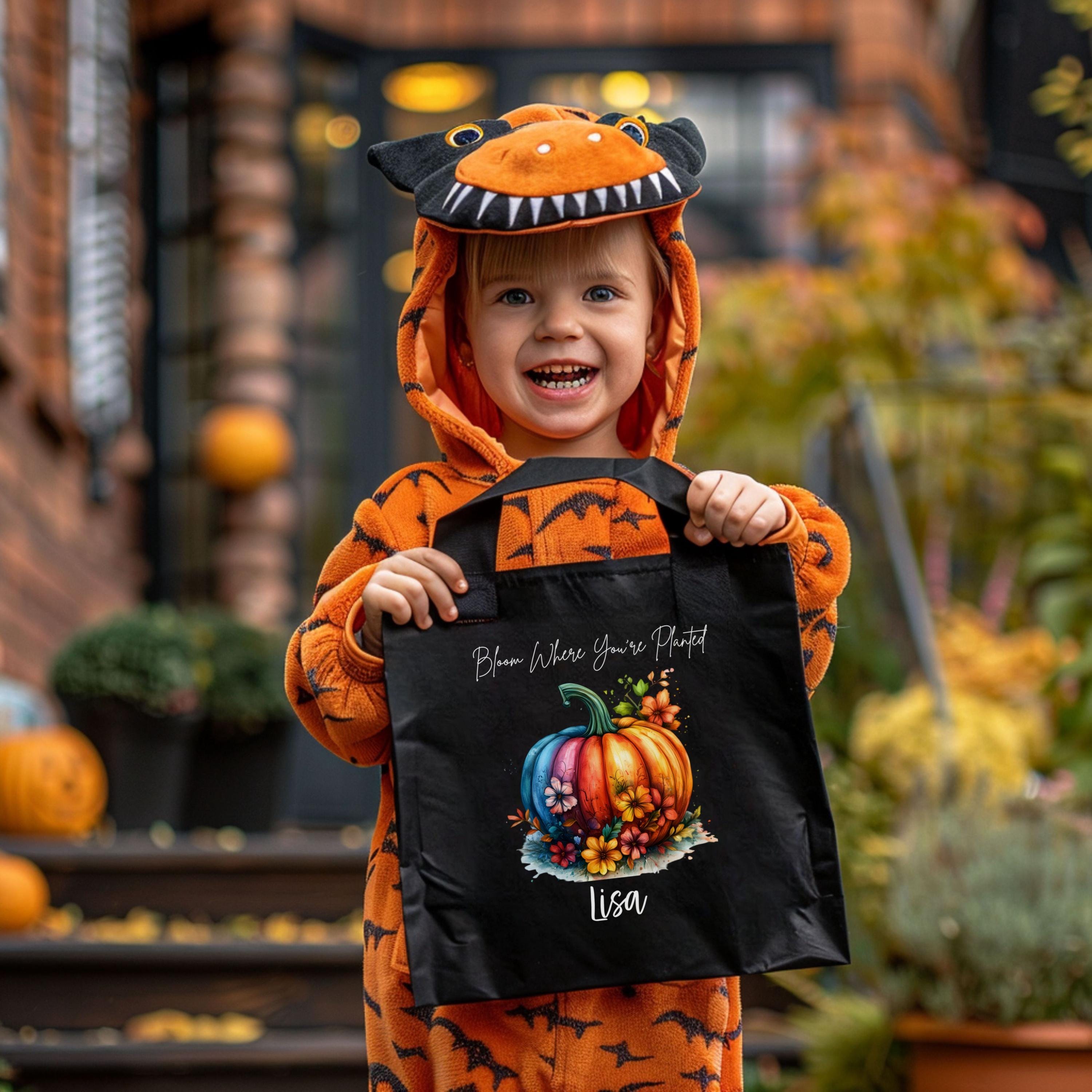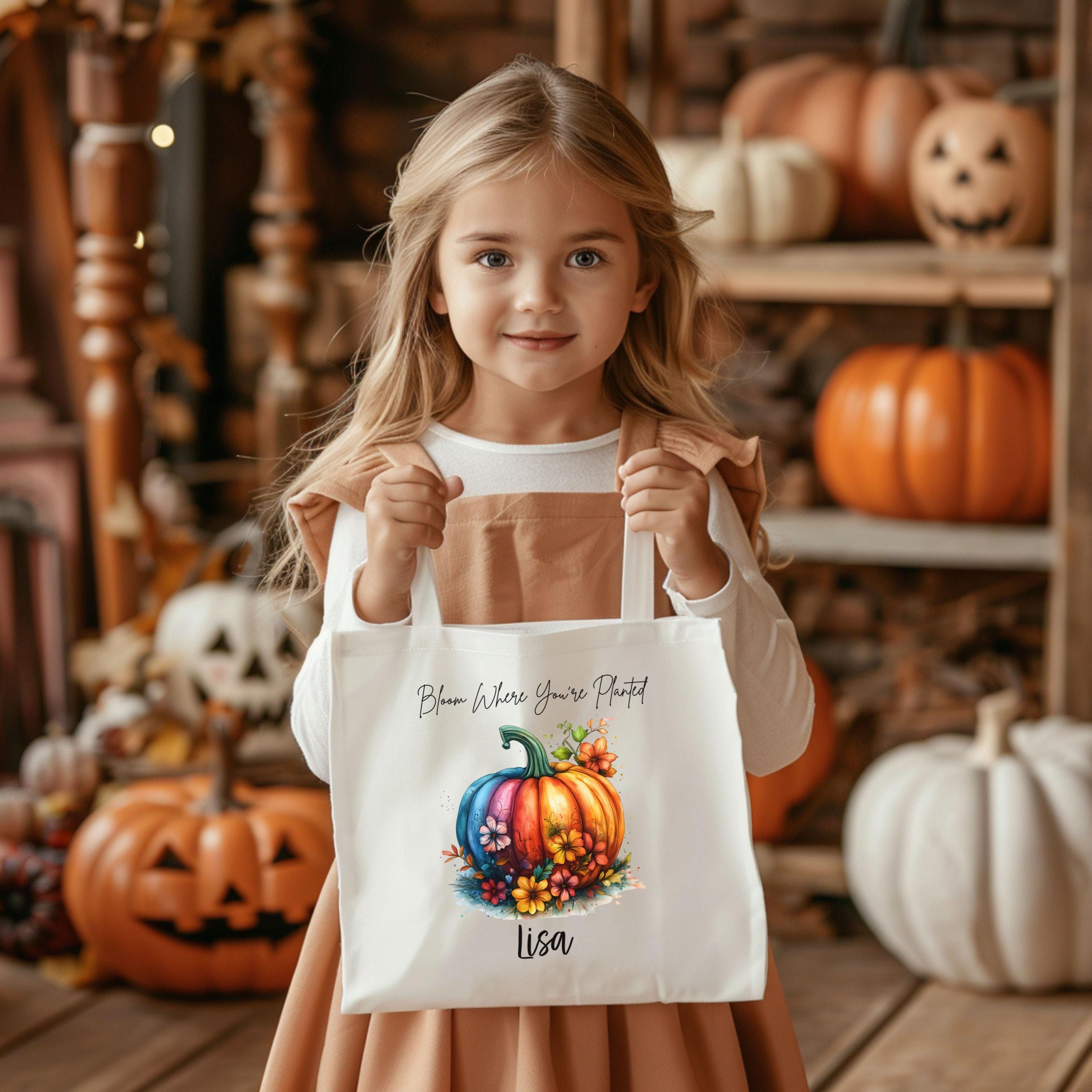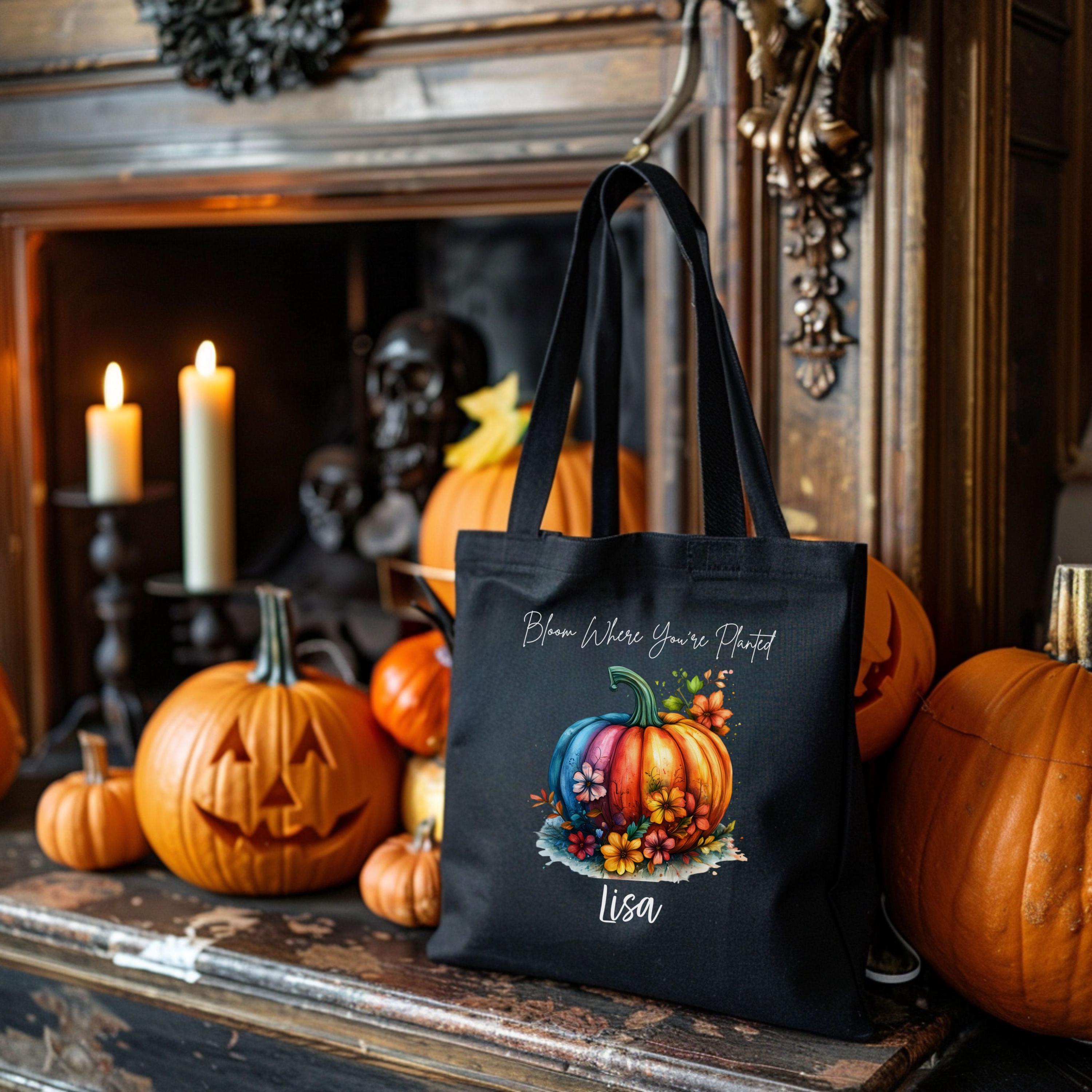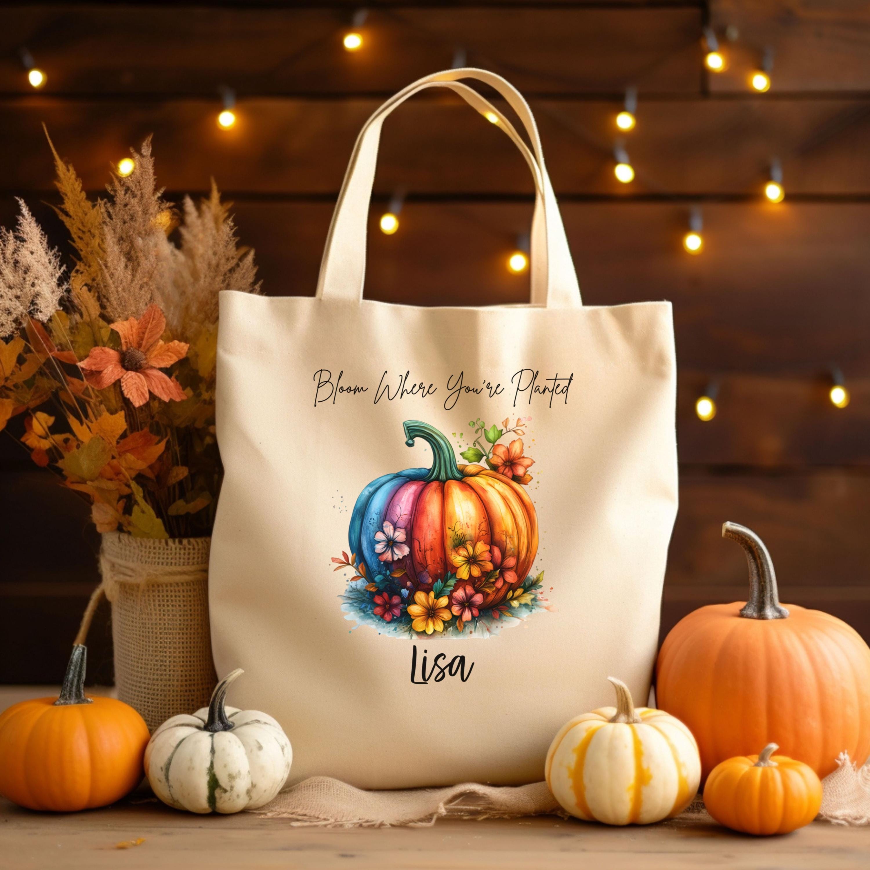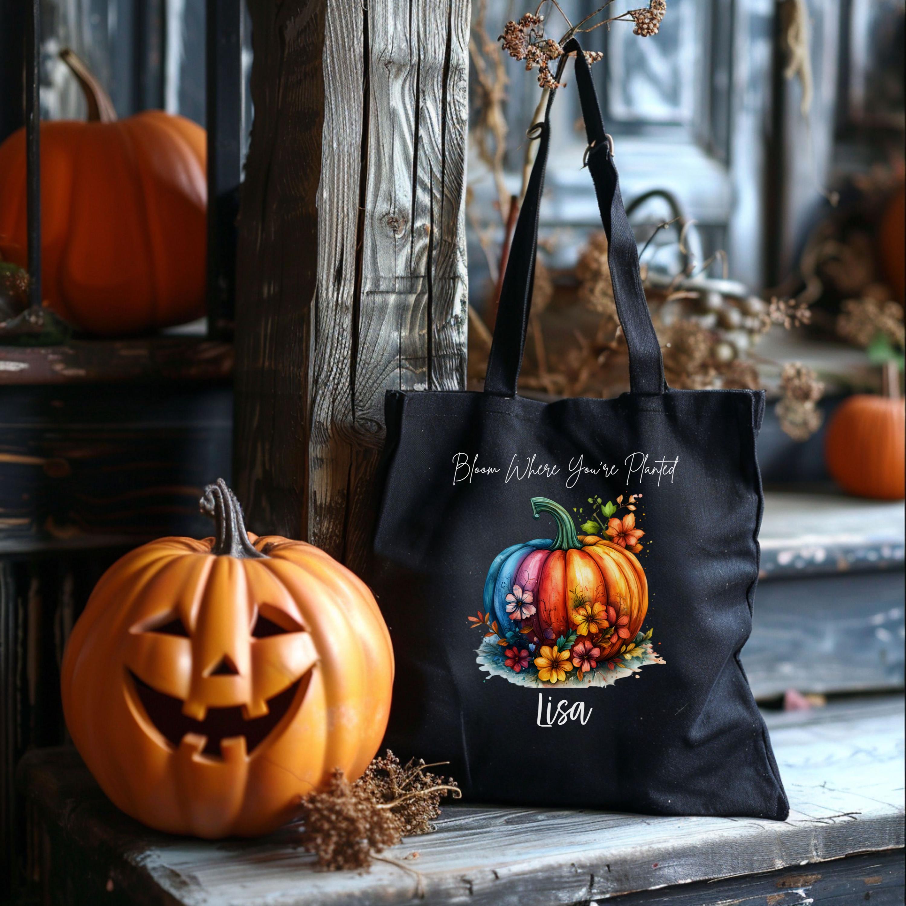 Celebrate cozy season with this personalized fall tote featuring our vibrant “Bloom Where You’re Planted” design. A multicolored pumpkin surrounded by autumn florals pops against your choice of natural or black canvas — perfect for gifting, errands, or seasonal flair.