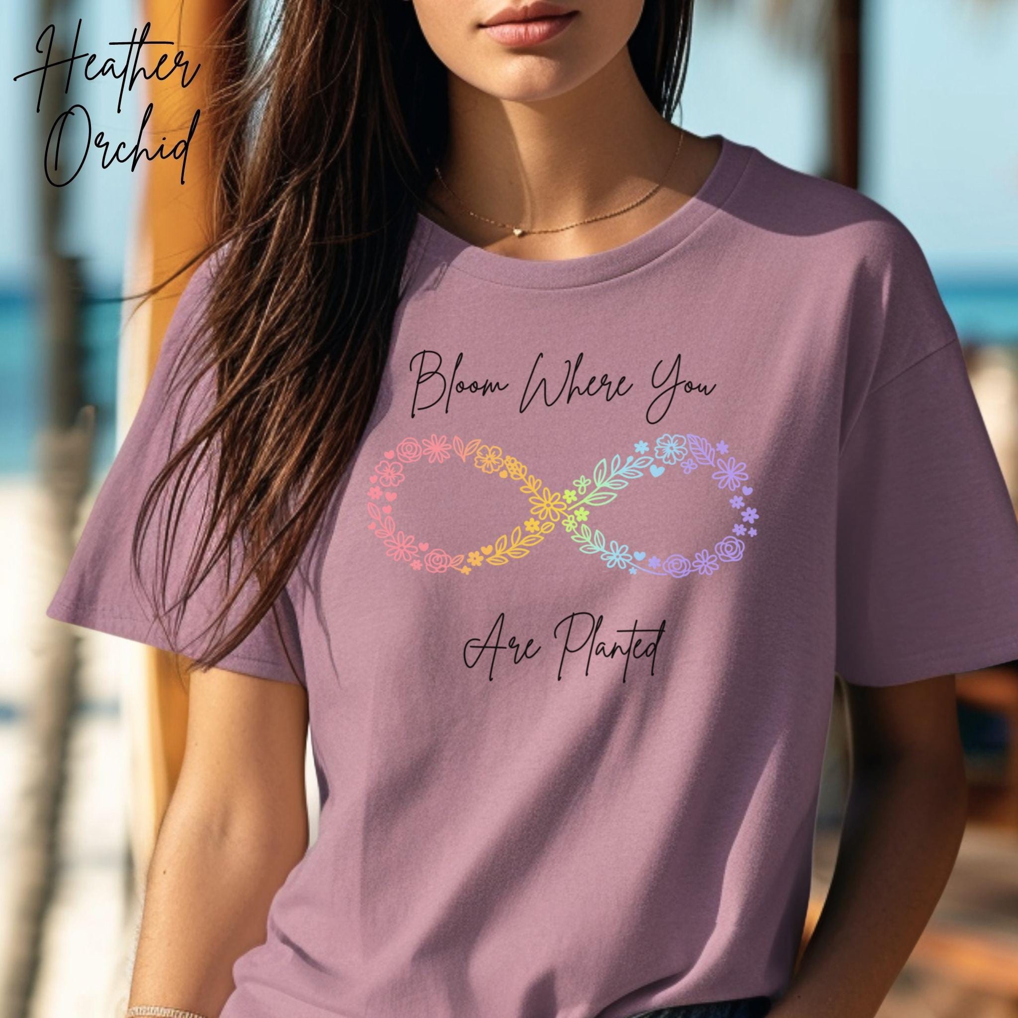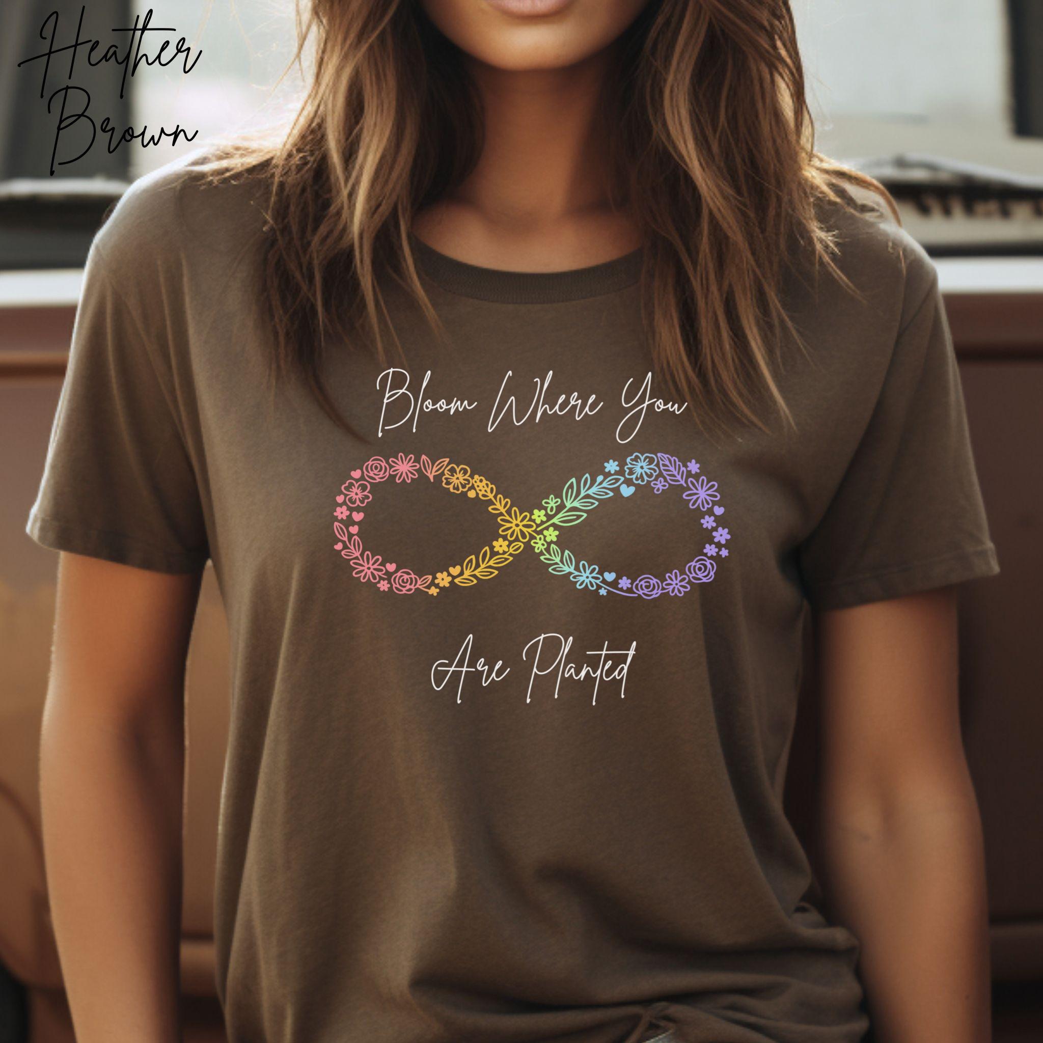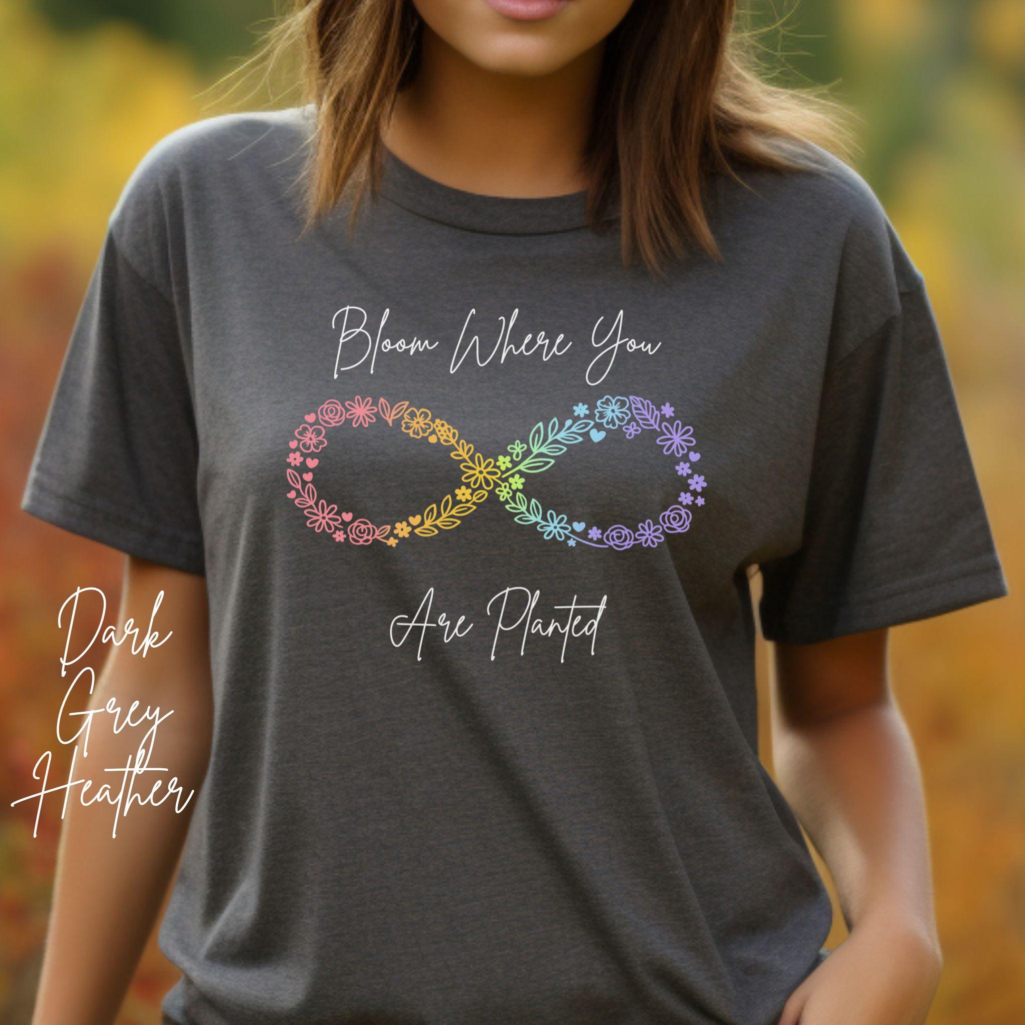 Let your growth shine with this "Bloom Where You Are Planted" floral infinity tee — a soft, uplifting design created for anyone embracing their own journey. The pastel‑rainbow floral infinity symbol represents resilience, transformation, and blooming in your own time, making it a meaningful gift for neurodivergent individuals, moms, teachers, and anyone who loves gentle encouragement.