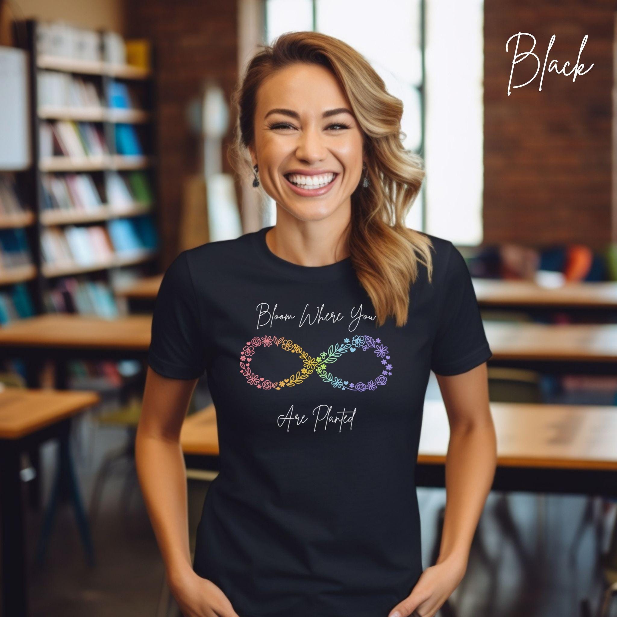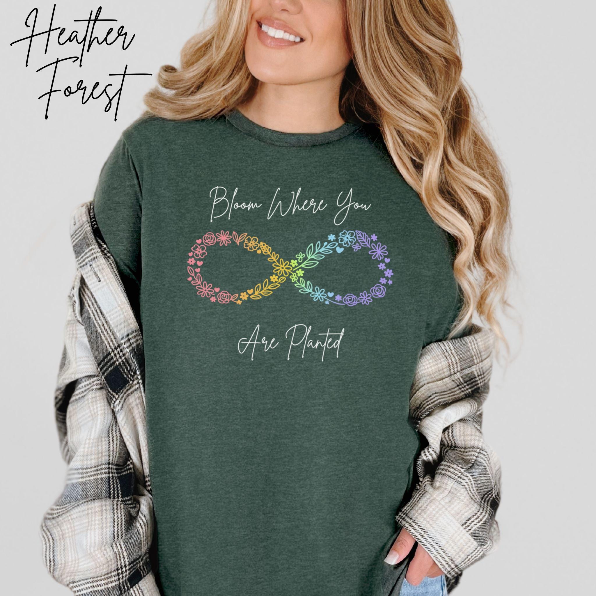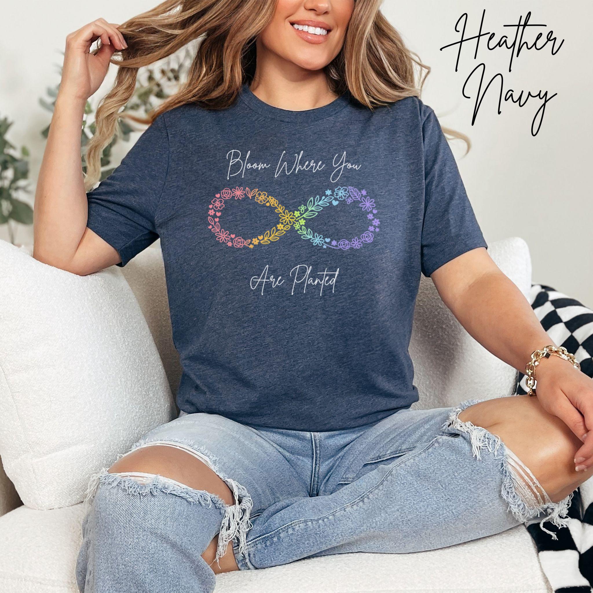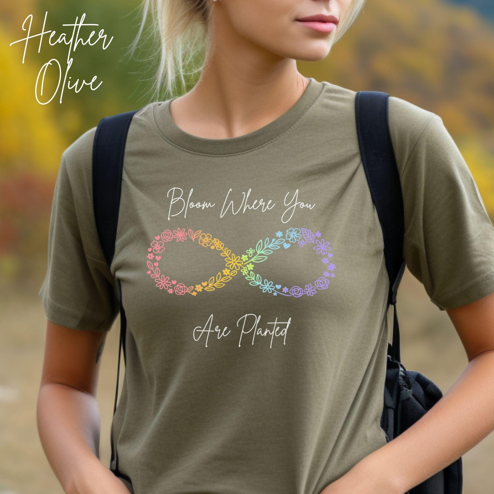 Let your growth shine with this "Bloom Where You Are Planted" floral infinity tee — a soft, uplifting design created for anyone embracing their own journey. The pastel‑rainbow floral infinity symbol represents resilience, transformation, and blooming in your own time, making it a meaningful gift for neurodivergent individuals, moms, teachers, and anyone who loves gentle encouragement.